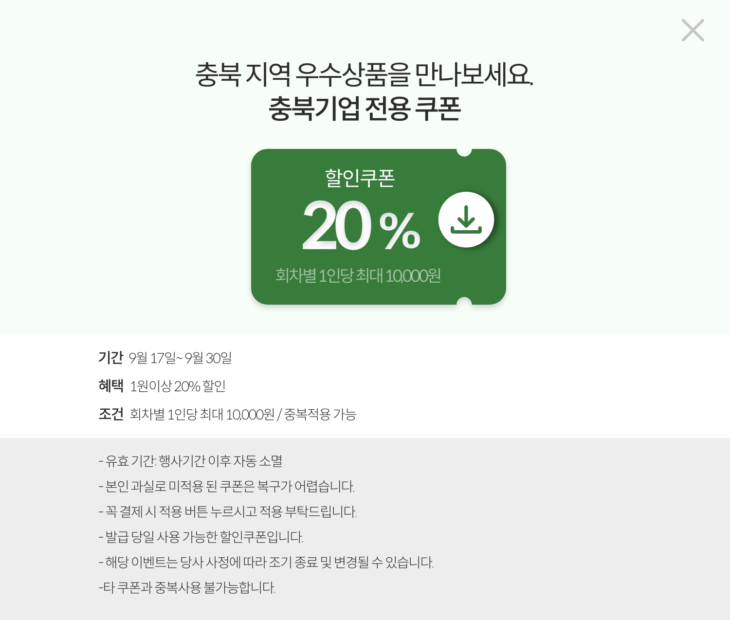 충북 지역 우수상품을 만나보세요. 충북기업 전용 20% 할인쿠폰(회차별 1인당 최대 10,000원, 9월17일~9월30일)