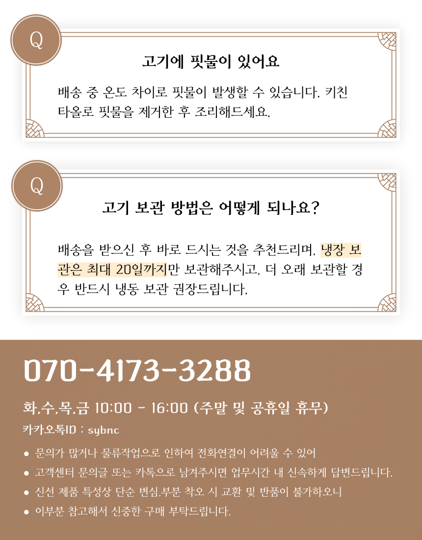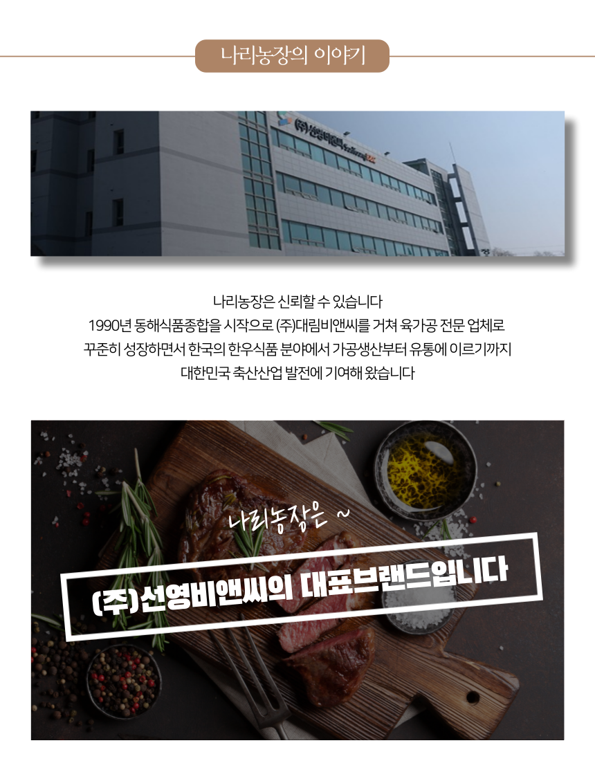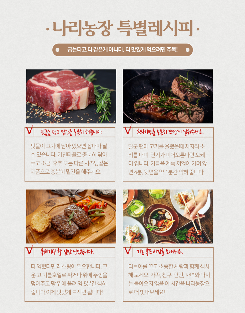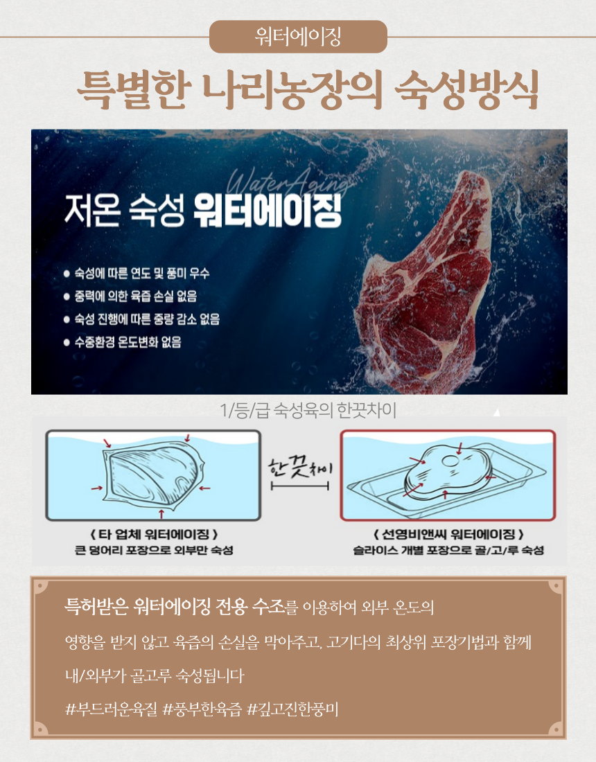 1. 믿을 수 있는 품질 : 특허받은 워터에이징 전용 수조를 이용하여 외부 온도의 영향을 받지 않고 육즙의 손실을 막아주고, 최상위 포장기법과 함께 내/외부가 골고루 숙성됩니다.