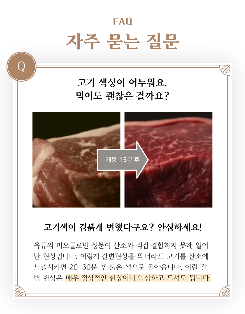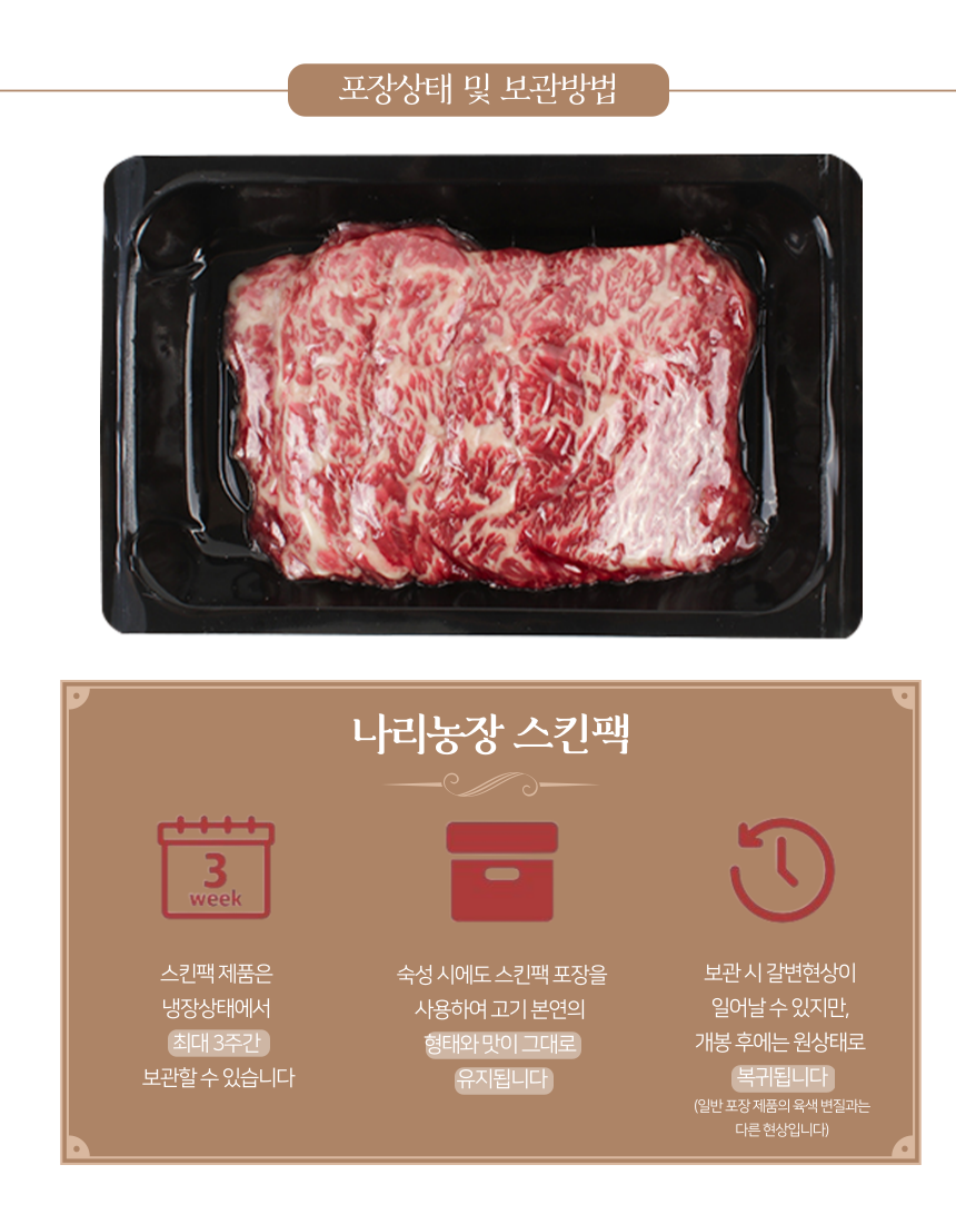 1. 믿을 수 있는 품질 : 특허받은 워터에이징 전용 수조를 이용하여 외부 온도의 영향을 받지 않고 육즙의 손실을 막아주고, 최상위 포장기법과 함께 내/외부가 골고루 숙성됩니다.