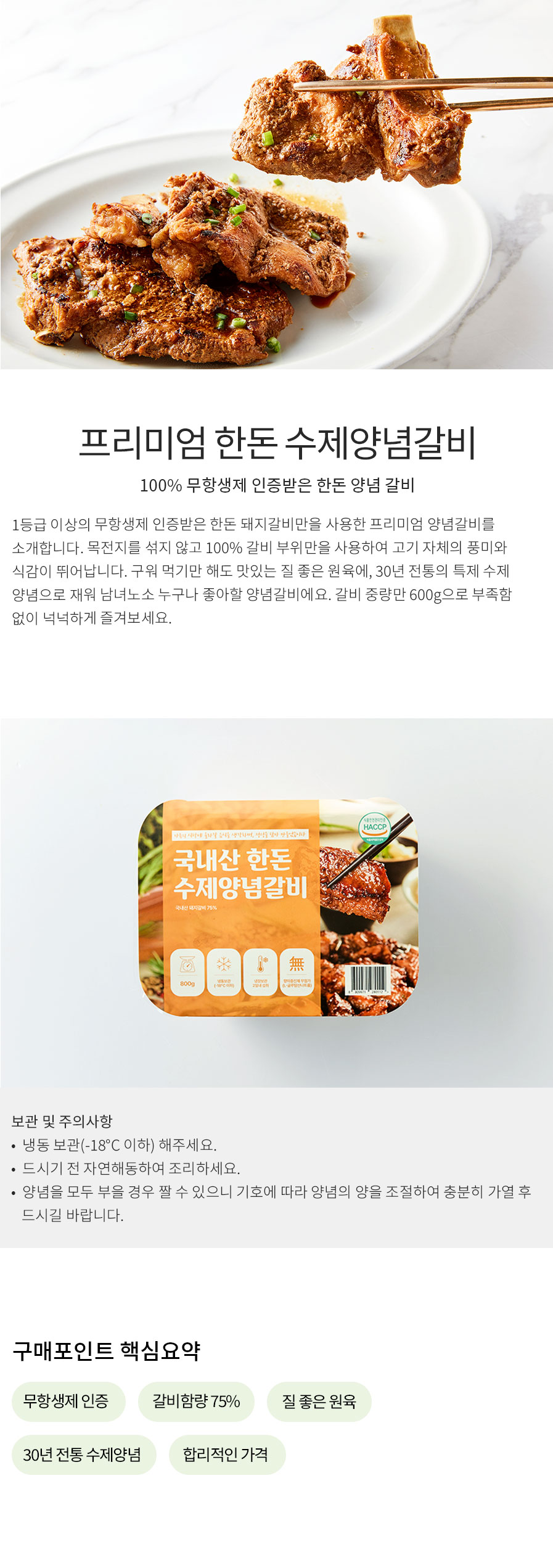 ('무항생돈' 표기가 삭제) 패키지의 표기만 변경 되며, 기존과 동일하게 100% 무항생제 인증받은 국내산 1등급 돼지고기 원료육만 사용합니다. 표시기준에 따라 원재료에 대한 인증은 패키지 뒷면 함량표기에 '돼지갈비(국내산, 무항생제 인증)'으로 명확히 표기되어 있으니 안심하세요. |