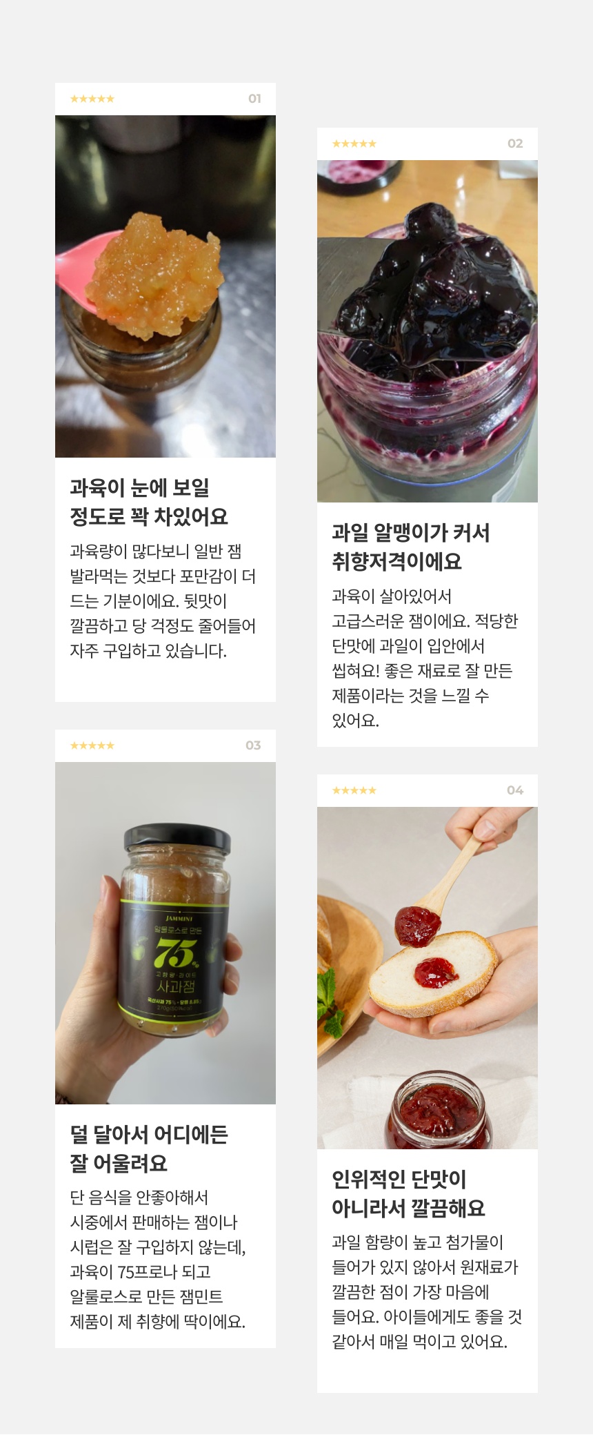 1. 딸기잼: 딸기 75%(국산), 알룰로스 24%, 레몬즙(스페인산), 펙틴 2. 블루베리잼: 블루베리 75%(미국산), 알룰로스 24%, 레몬즙(스페인산), 펙틴 3. 사과잼: 사과 75%(국산), 알룰로스 24%, 레몬즙(스페인산), 펙틴