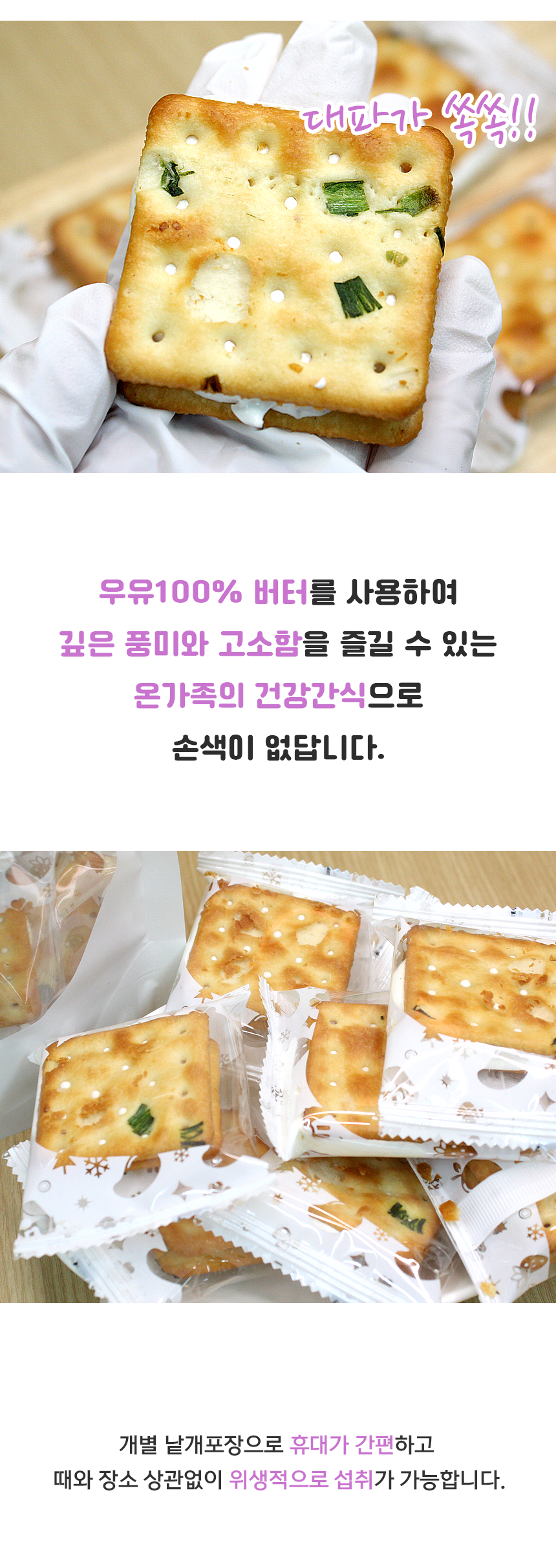 100%우유버터를 사용하여 풍미가 깊고 고급스런 크래커입니다.