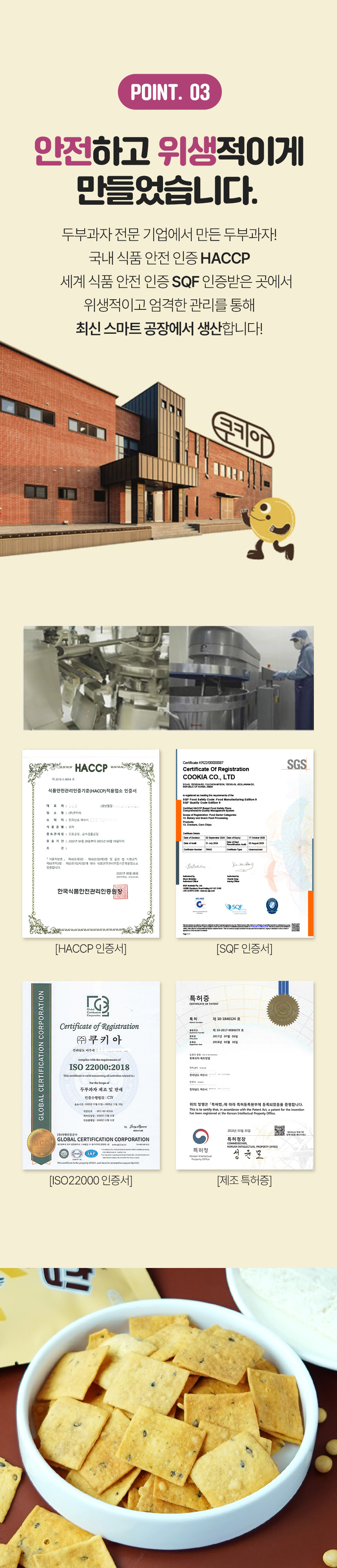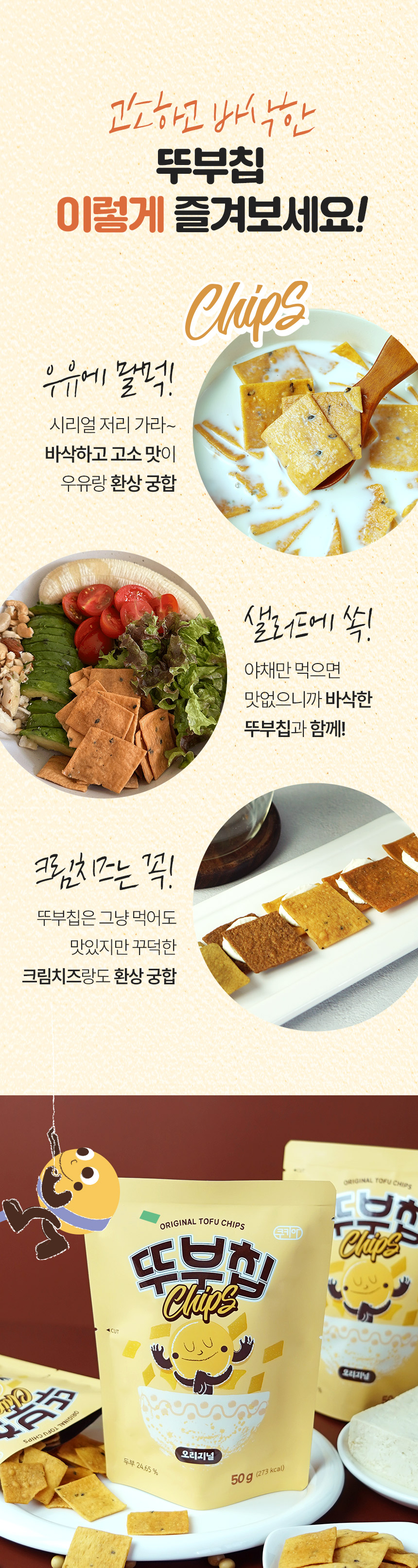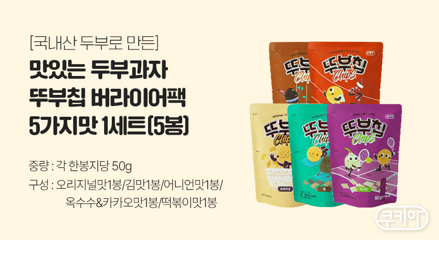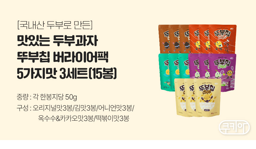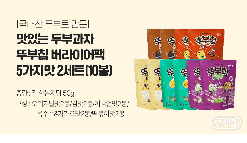 "오리지널 : 밀가루36%(국내산),두부24%(국내산),대두유16%[외국산(미국,브라질,파라과이등)],설탕12%,계란4%(국내산),아몬드분말2%(아몬드,소맥분),볶음검정깨,구운소금,팽창제제(산성피로인산나트륨,탄산수소나트륨,옥수수전분,제일인산칼슘),혼합제제(전분,밀크에멀죤,바닐린,바닐라오일),천연향신료(육두구분말) 옥수수&카카오 : 두부24%[대두(국내산),정제간수(정제소금,염화마그네슘,글루코노델타락톤)],박력분19%(밀:미국산),골드콘17%(옥수수{외국산(프랑스,호주,인도산 등)},옥수수유,치차황색소,치차적색소,대두유16%[대두(외국산(미국,브라질,파라과이 등))},설탕13%,계란4%(국내산),아몬드분말2%(아몬드 소맥문),구운소금,카카오분말0.73%(말레이시아산),탄산칼슘0,61%,천연향신료0.07%(육두구분말) 어니언 : 밀가루43%(밀:국내산),두부20%[대두(국내산),정제간수(정제소금,염화마그네슘,글루코노델타락톤)],대두유17%{외국산(미국,브라질,파라과이 등)}, 설탕12%, 구운양파분말2%[물엿,양파분말(양파:중국산),말토덱스트린,옥수수유,볶은양파농축액(프랑스산)],계란2%(국내산),구운소금,팽창제제(산성피로인산나트륨,탄산수소나트륨,옥수수전분,제일인산칼슘) 김 : 밀가루26%(밀:국내산),두부22%[대두(국내산),혼합제제(글루코노델타락톤,염화마그네슘,정제소금,황산칼슘)],대두유17%[대두{외국산(미국,브라질,파라과이)}],설탕13%,분리대두단백9%(대두:중국산),계란4%(국내산),아몬드분말2%,김분말1%(국내산),구운소금,천연향신료(육두구분말),효소제 떡볶이 : 밀가루40%(밀:국내산),두부18%[대두(국내산),정제간수(정제소금,염화마그네슘,글루코노델타락톤)],설탕18%,대두유18%[대두{외국산(미국,브라질,파라과이 등)}],떡볶이소스분말[백설탕,고춧가루(베트남산),복합조미식품1%,L-글루탐산나트륨,천연향신료(흑후추)},구운소금,천연향신료(파슬리분말)"