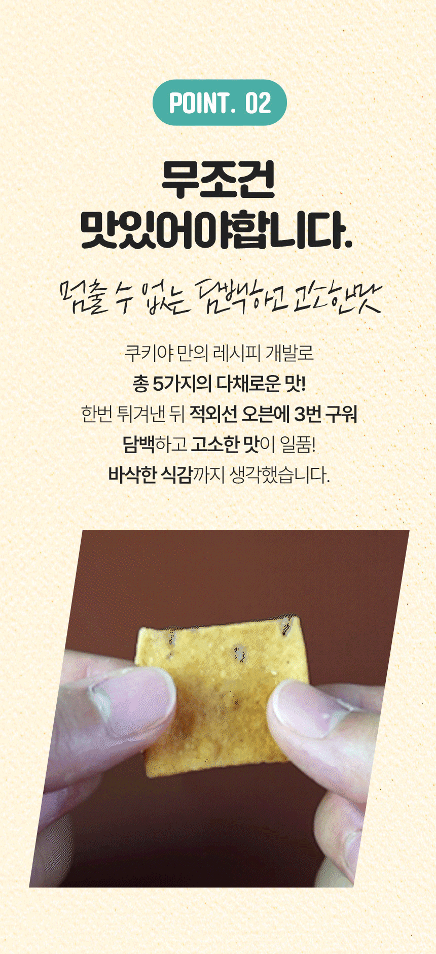 "오리지널 : 총 내용량 50g / 열량 273kcal / 나트륨 180mg / 탄수화물 29g / 당류 8g / 지방 15g / 트랜스지방 0g / 포화지방 2g / 콜리스테롤 9mg / 단백질 5g 옥수수&카카오 : 총 내용량 50g / 열량 260kcal / 나트륨 155mg / 탄수화물 31g / 당류 8g / 지방 13g / 트랜스지방 0g / 포화지방 1.4g / 콜리스테롤 3mg / 단백질 5g 어니언 : 총 내용량 50g / 열량 270kcal / 나트륨 220mg / 탄수화물 28.9g / 당류 5.8g / 지방 15g / 트랜스지방 0g / 포화지방 2g / 콜리스테롤 4.9mg / 단백질 5.1g 김 : 총 내용량 50g / 열량 265kcal / 나트륨 447mg / 탄수화물 24g / 당류 7g / 지방 14g / 트랜스지방 0g / 포화지방 1.9g / 콜리스테롤 12mg / 단백질 10.2g 떡볶이 : 총 내용량 50g / 열량 260kcal / 나트륨 290mg / 탄수화물 30g / 당류 9g / 지방 13g / 트랜스지방 0g / 포화지방 1.6g / 콜리스테롤 0.5mg / 단백질 5g"