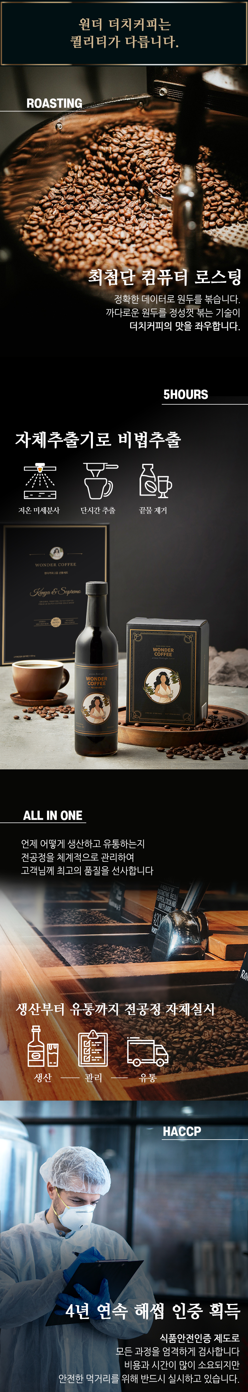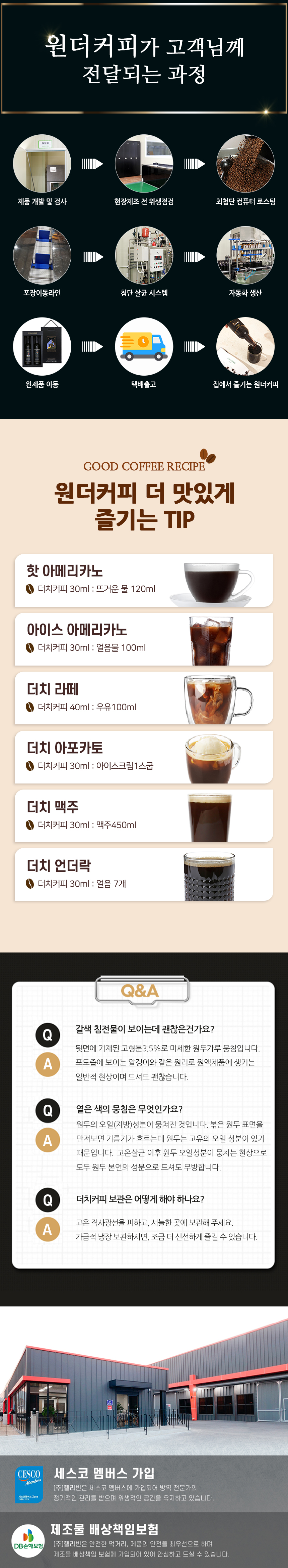 아라비카 품종 100% 원두, 슈프리모/케냐AA 상급원두 사용으로 커피의 맛과 향이 더욱 진합니다.