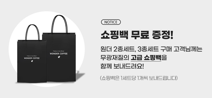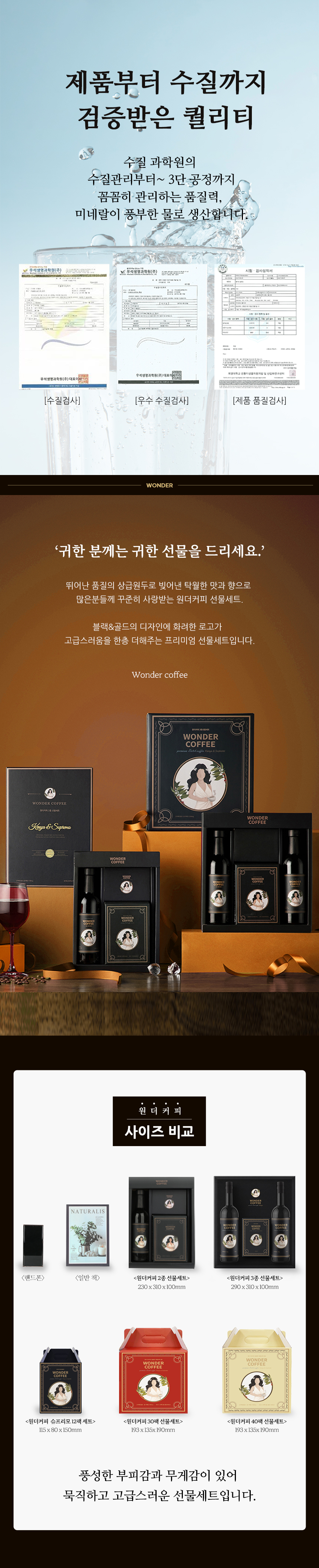 고급스러운 원더커피 2종 선물세트, 유리병과 파우치 세트 혼합 구성으로 다양하게 즐길 수 있습니다.