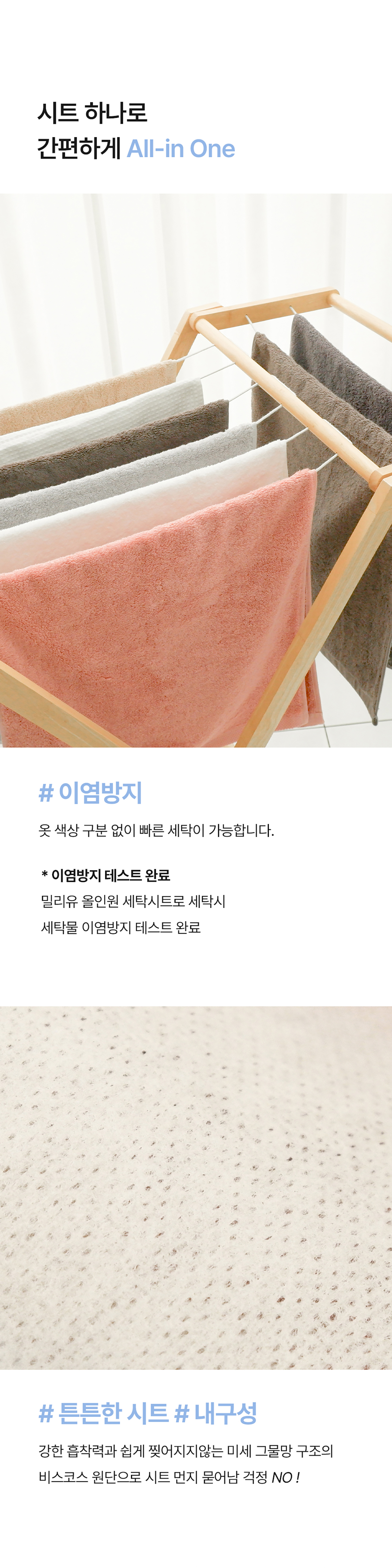 1. 세탁+이염방지 특허 기술로 분리세탁 필요 없이 간편하게 한 장으로 세탁(이염방지 테스트 완료)