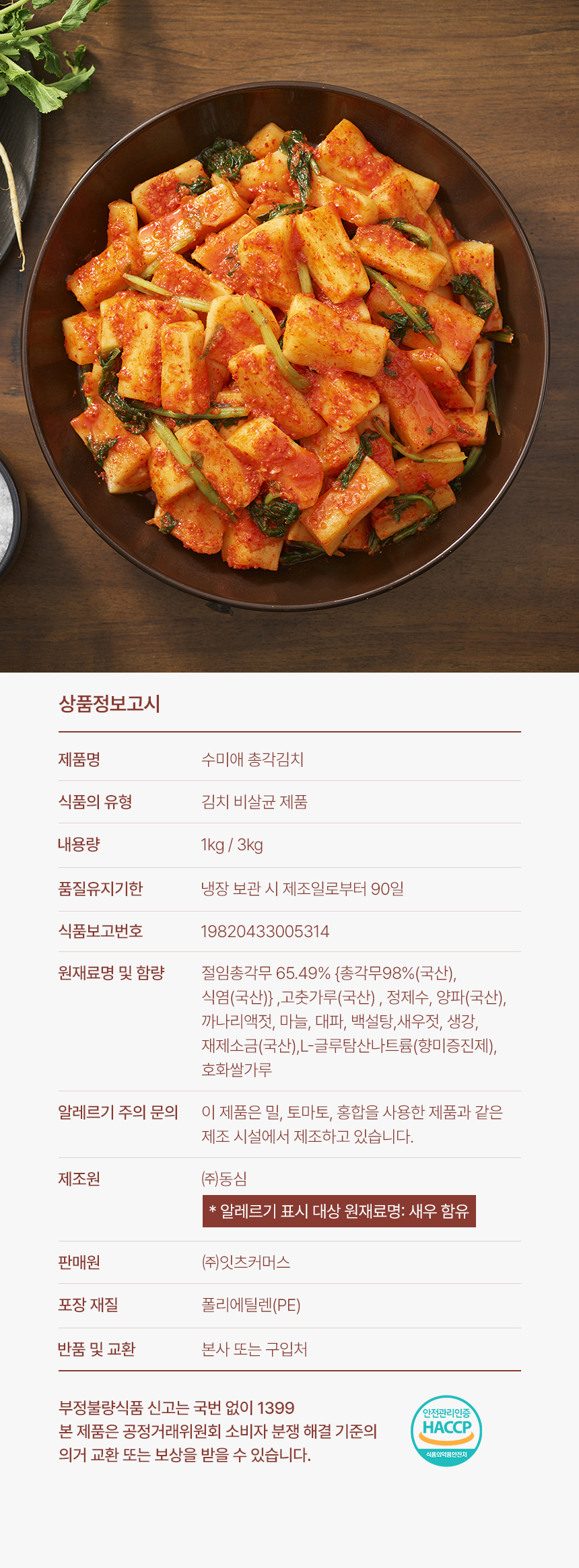 절임총각무 65.49%{총각무98%(국산), 식염(국산)}, 고춧가루(국산), 정제수, 양파(국산), 까나리액젓, 마늘, 대파, 백설탕, 새우젓, 생강, 재제소금(국산), L-글루탐산나트륨(향미증진제), 호화쌀가루 알레르기 유발물질: 새우함유 |