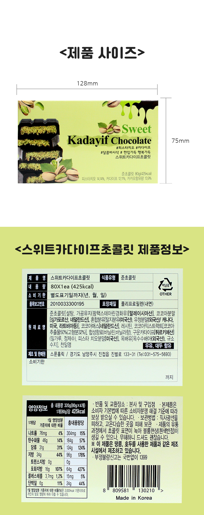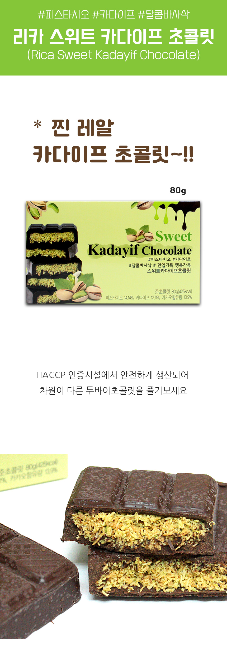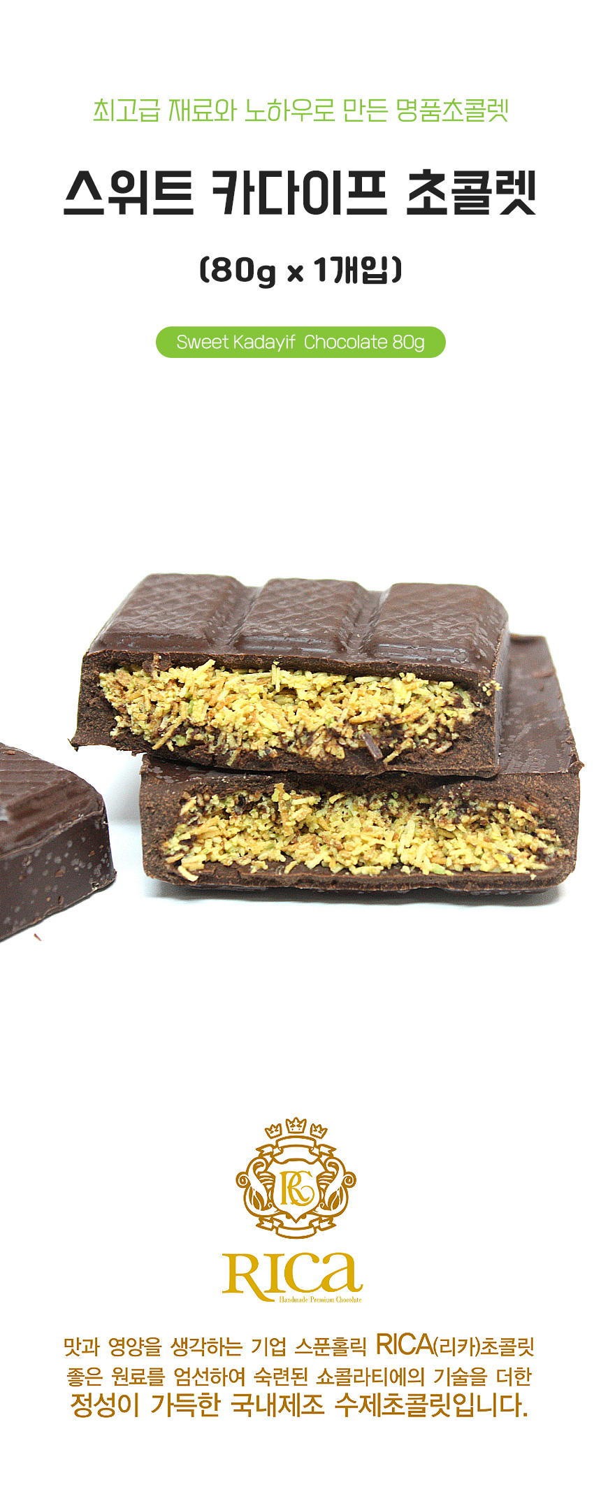 리카 스위트 카다이프 초콜릿 80g 1개 피스타치오 두바이초콜릿 프리미엄 초콜렛 디저트 간식