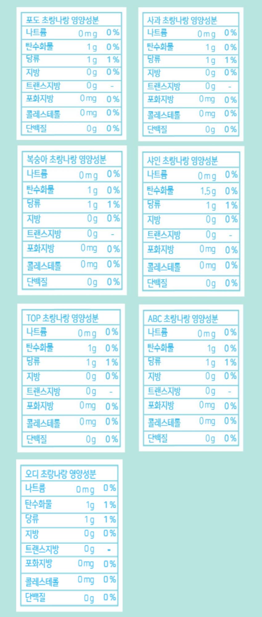 포도 나트륨0mg(0%), 탄수화물1g(0%), 당류1g(1%), 지방0g(0%), 트랜스지방0g, 포화지방0g(0%), 콜레스테롤0mg(0%), 단백질0g(0%) 사과 나트륨0mg(0%), 탄수화물1g(0%), 당류1g(1%), 지방0g(0%), 트랜스지방0g, 포화지방0g(0%), 콜레스테롤0mg(0%), 단백질0g(0%) 복숭아 나트륨0mg(0%), 탄수화물1g(0%), 당류1g(1%), 지방0g(0%), 트랜스지방0g, 포화지방0g(0%), 콜레스테롤0mg(0%), 단백질0g(0%) 샤인 나트륨0mg(0%), 탄수화물1.5g(0%), 당류1g(1%), 지방0g(0%), 트랜스지방0g, 포화지방0g(0%), 콜레스테롤0mg(0%), 단백질0g(0%) TOP 나트륨0mg(0%), 탄수화물1g(1%), 당류1g(1%), 지방0g(0%), 트랜스지방0g, 포화지방0g(0%), 콜레스테롤0mg(0%), 단백질0g(0%) ABC 나트륨0mg(0%), 탄수화물1g(0%), 당류1g(1%), 지방0g(0%), 트랜스지방0g, 포화지방0g(0%), 콜레스테롤0mg(0%), 단백질0g(0%)