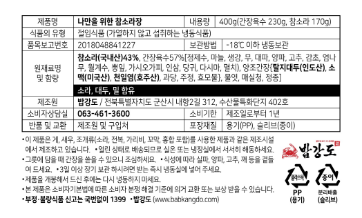 참소라 43%(국내산), 육수57%(정제수,마늘,생강,무,대파,양파,고추,감초,엄나무,월계수,뽕잎,가시오가피,인삼,당귀,다시마,멸치), 양조간장16%(탈지대두(인도산),소맥(미국산),천일염(호주산),과당,주정,호모물), 물엿, 매실청, 정종