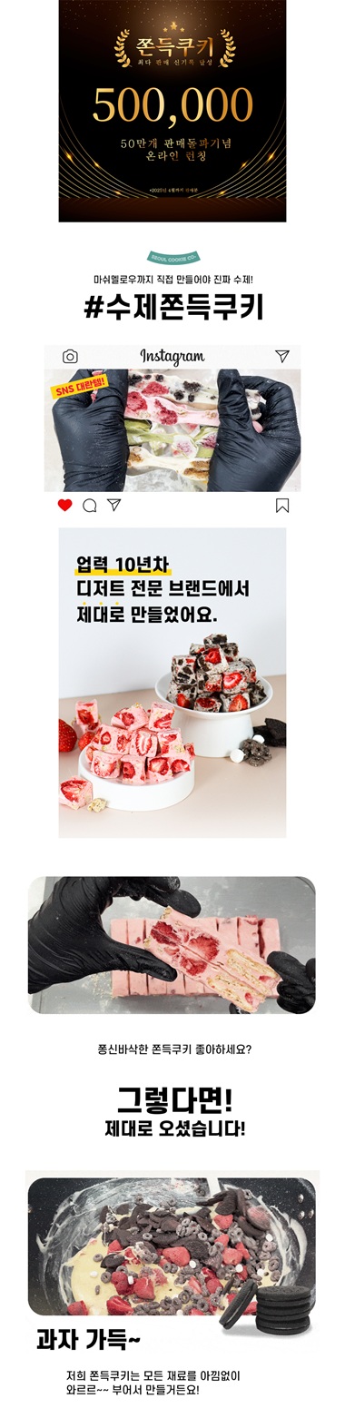 마쉬멜로우까지 직접 만드는 찐 수제 쫀득쿠키! 부재료도 가득 넣어 더욱 다양한 맛과 식감을 느낄 수 있어요!