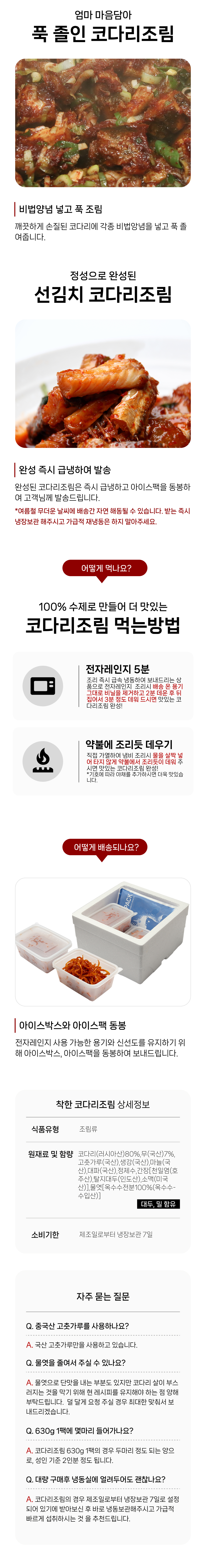 코다리(러시아산)80%,무(국산)7%,고춧가루(국산),생강(국산),마늘(국산),대파(국산),정제수,간장[천일염(호주산),탈지대두(인도산),소맥(미국산)],물엿[옥수수전분100%(옥수수-수입산)]