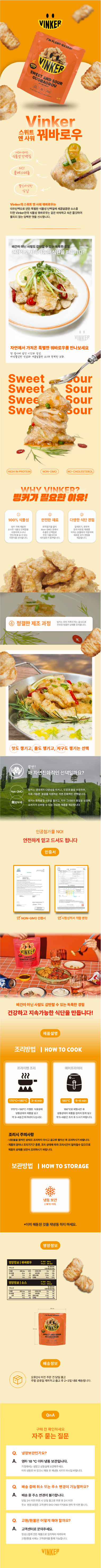 VINKER의 스위트 앤 사워 식물성 꿔바로우는 겉은 바삭하고 속은 쫄깃하여 물리지 않는 담백한 맛을 선사합니다