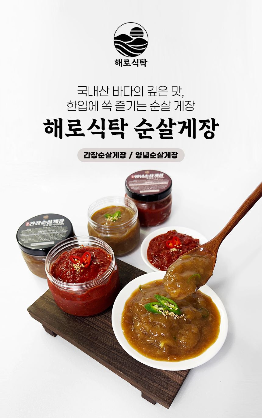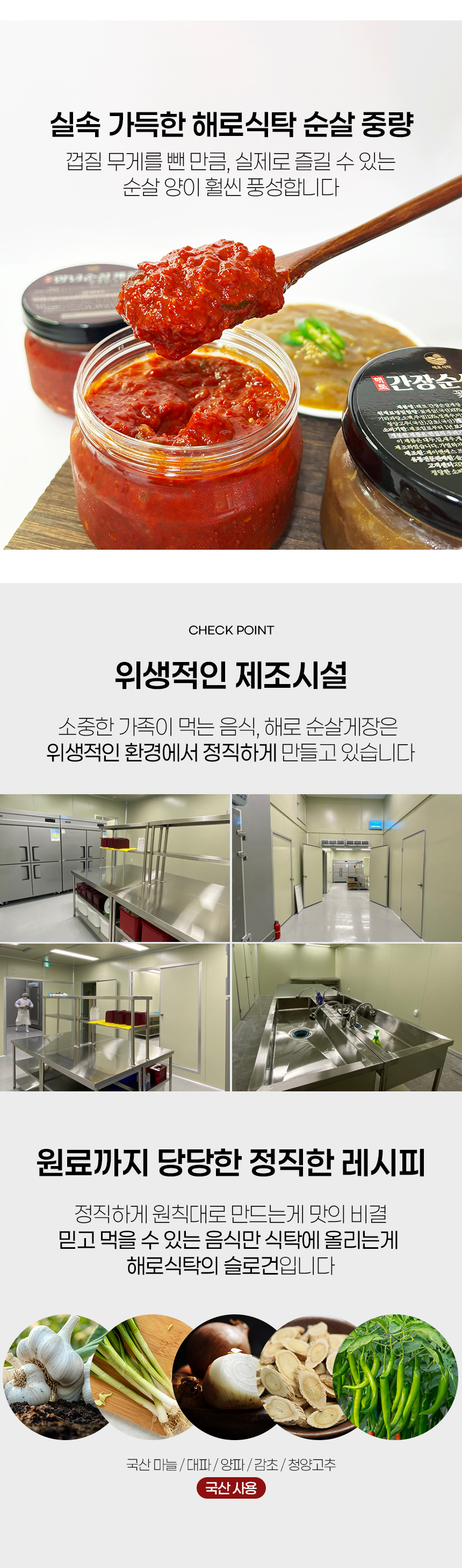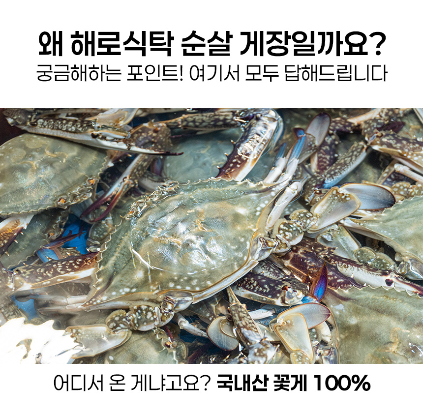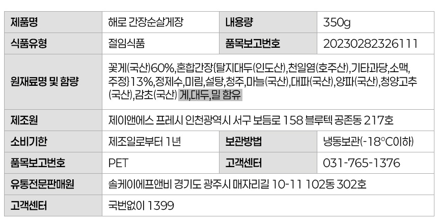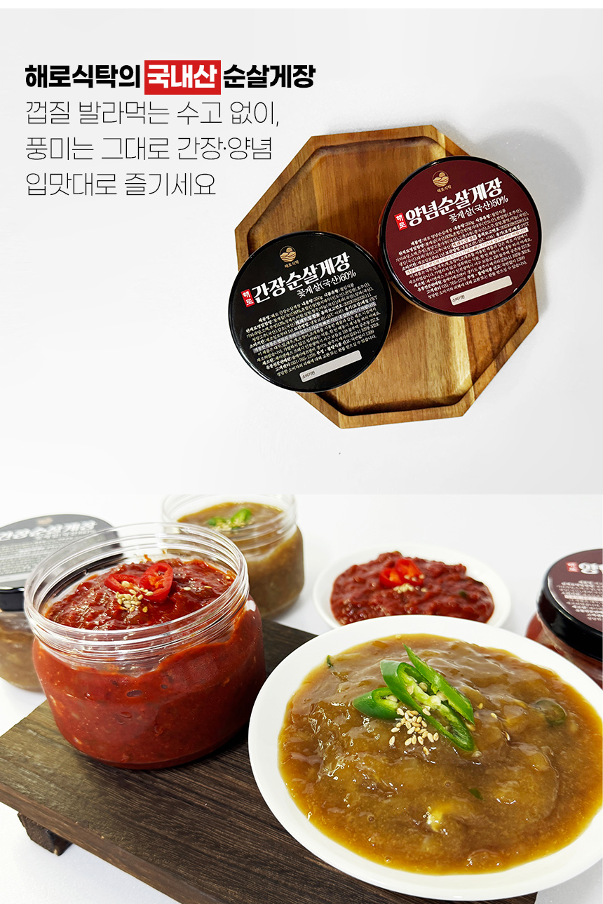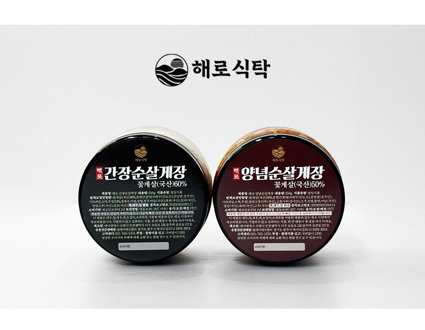 해로 간장순살게장 : 꽃게살(국산)60%,혼합간장{탈지대두(인도산),천일염(호주산),기타과당,소맥,주정}13%,정제수,미림,설탕,청주,마늘(국산),대파(국산),양파(국산),청양고추(국산),감초(국산) 해로 양념순살게장 : 꽃게살(국산)50%,혼합간장{탈지대두(인도산),천일염(호주산),기타과당,소맥,주정},청양고춧가루(국산),고춧가루(중국산),소주,설탕,물엿,마늘(국산),생강(국산),대파(국산),고추(국산)