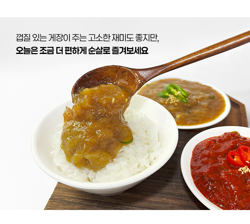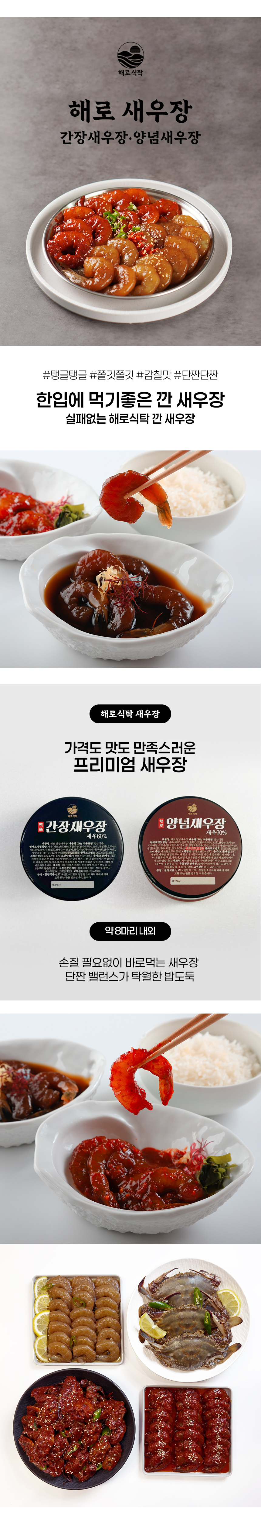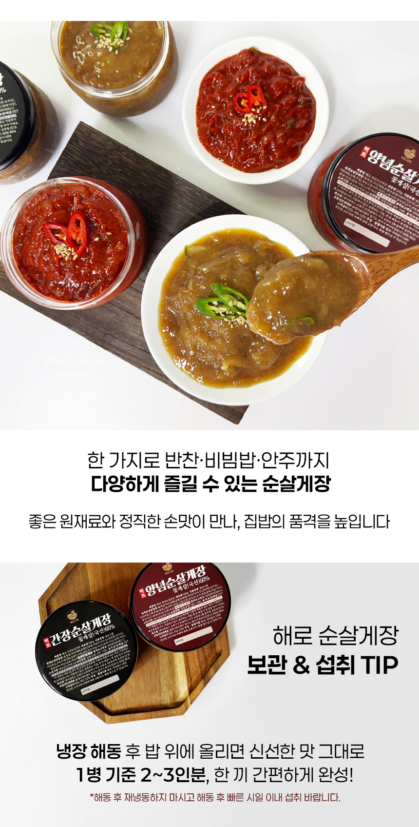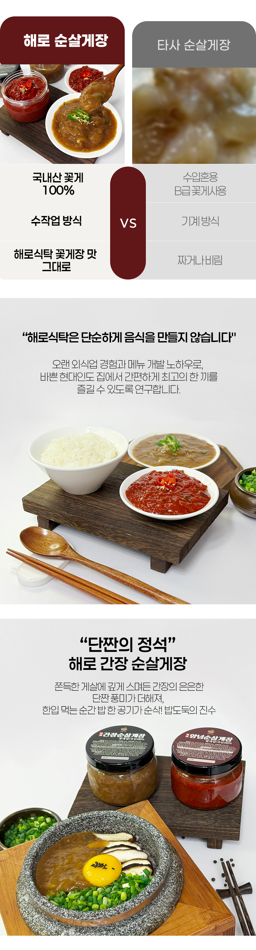 해로 간장순살게장 : 꽃게살(국산)60%,혼합간장{탈지대두(인도산),천일염(호주산),기타과당,소맥,주정}13%,정제수,미림,설탕,청주,마늘(국산),대파(국산),양파(국산),청양고추(국산),감초(국산) 해로 양념순살게장 : 꽃게살(국산)50%,혼합간장{탈지대두(인도산),천일염(호주산),기타과당,소맥,주정},청양고춧가루(국산),고춧가루(중국산),소주,설탕,물엿,마늘(국산),생강(국산),대파(국산),고추(국산)