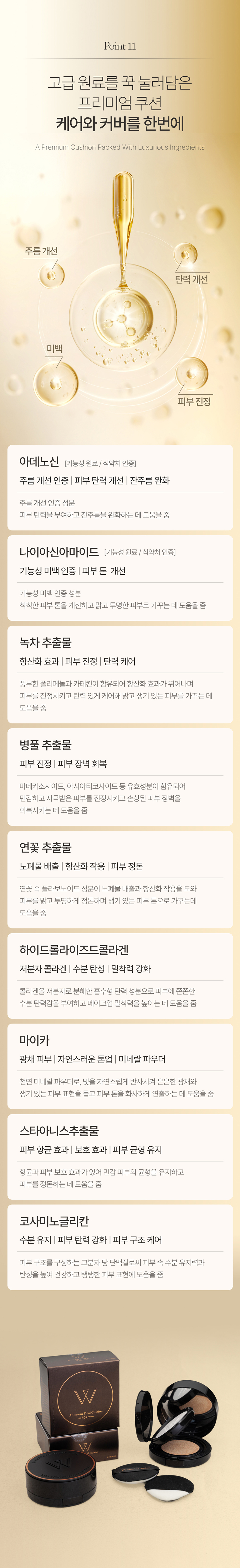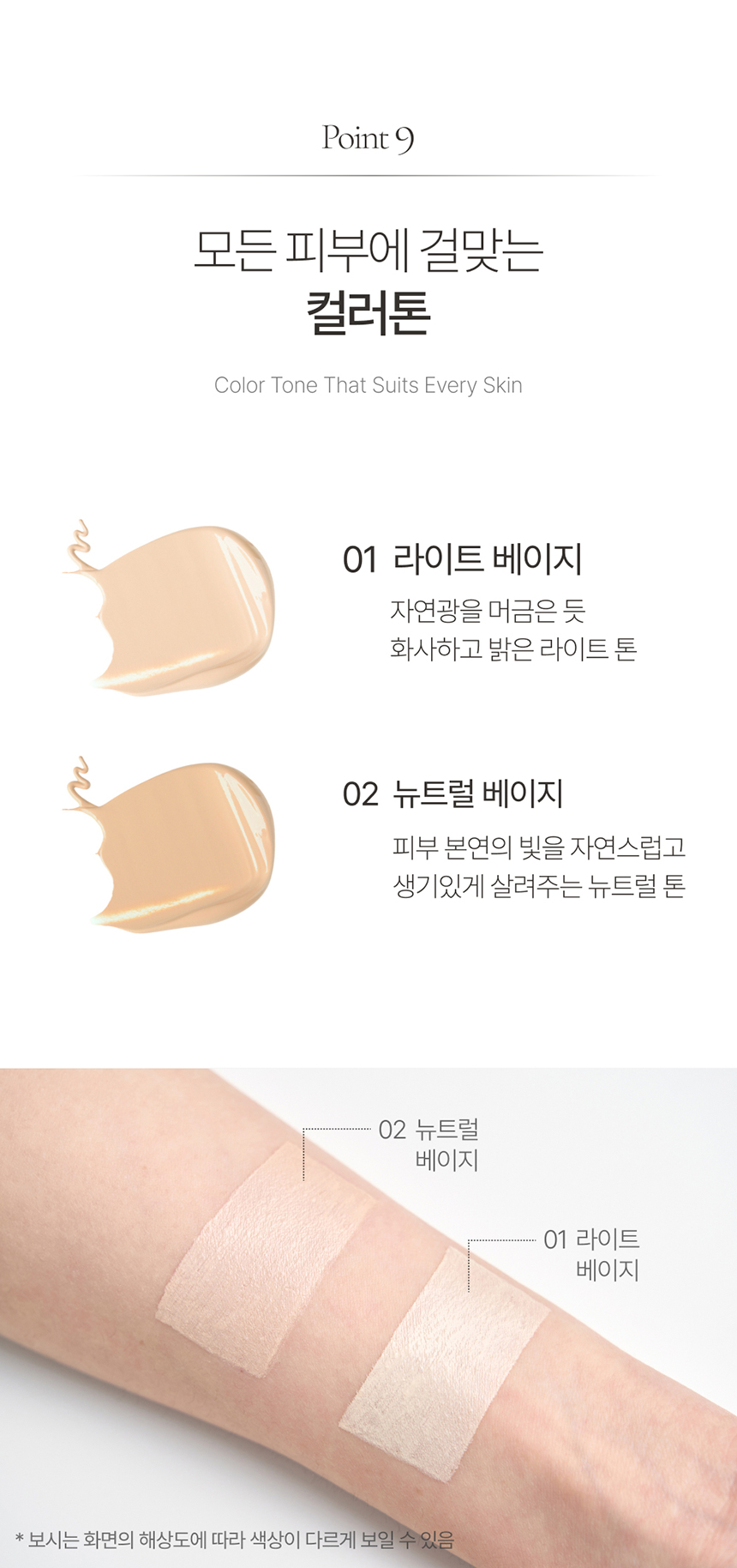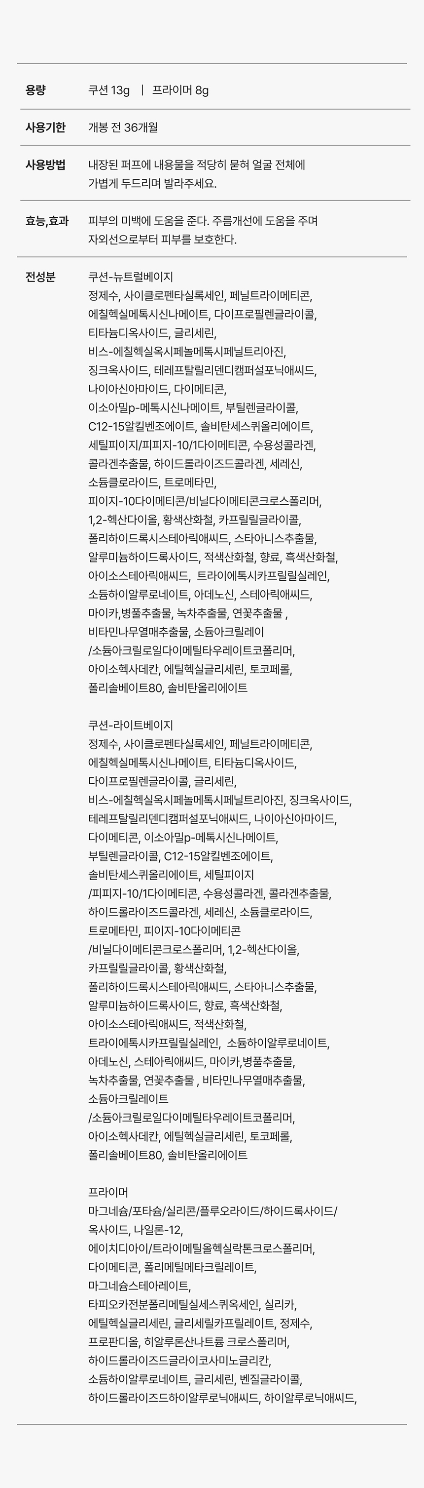 [라이트베이지] 정제수, 사이클로펜타실록세인, 페닐트라이메티콘, 에칠헥실메톡시신나메이트, 티타늄디옥사이드, 다이프로필렌글라이콜, 글리세린, 비스-에칠헥실옥시페놀메톡시페닐트리아진, 징크옥사이드, 테레프탈릴리덴디캠퍼설포닉애씨드, 나이아신아마이드, 다이메티콘, 이소아밀p-메톡시신나메이트, 부틸렌글라이콜, C12-15알킬벤조에이트, 솔비탄세스퀴올리에이트, 세틸피이지/피피지-10/1다이메티콘, 수용성콜라겐, 콜라겐추출물, 하이드롤라이즈드콜라겐, 세레신, 소듐클로라이드, 트로메타민, 피이지-10다이메티콘/비닐다이메티콘크로스폴리머, 1,2-헥산다이올, 카프릴릴글라이콜, 황색산화철, 폴리하이드록시스테아릭애씨드, 스타아니스추출물, 알루미늄하이드록사이드, 향료, 흑색산화철, 아이소스테아릭애씨드, 적색산화철, 트라이에톡시카프릴릴실레인, 소듐하이알루로네이트, 아데노신, 스테아릭애씨드, 마이카,병풀추출물, 녹차추출물, 연꽃추출물 , 비타민나무열매추출물, 소듐아크릴레이트/소듐아크릴로일다이메틸타우레이트코폴리머, 아이소헥사데칸, 에틸헥실글리세린, 토코페롤, 폴리솔베이트80, 솔비탄올리에이트[뉴트럴베이지] 정제수, 사이클로펜타실록세인, 페닐트라이메티콘, 에칠헥실메톡시신나메이트, 다이프로필렌글라이콜, 티타늄디옥사이드, 글리세린, 비스-에칠헥실옥시페놀메톡시페닐트리아진, 징크옥사이드, 테레프탈릴리덴디캠퍼설포닉애씨드, 나이아신아마이드, 다이메티콘, 이소아밀p-메톡시신나메이트, 부틸렌글라이콜, C12-15알킬벤조에이트, 솔비탄세스퀴올리에이트, 세틸피이지/피피지-10/1다이메티콘, 수용성콜라겐, 콜라겐추출물, 하이드롤라이즈드콜라겐, 세레신, 소듐클로라이드, 트로메타민, 피이지-10다이메티콘/비닐다이메티콘크로스폴리머, 1,2-헥산다이올, 황색산화철, 카프릴릴글라이콜, 폴리하이드록시스테아릭애씨드, 스타아니스추출물, 알루미늄하이드록사이드, 적색산화철, 향료, 흑색산화철, 아이소스테아릭애씨드, 트라이에톡시카프릴릴실레인, 소듐하이알루로네이트, 아데노신, 스테아릭애씨드, 마이카,병풀추출물, 녹차추출물, 연꽃추출물 , 비타민나무열매추출물, 소듐아크릴레이트/소듐아크릴로일다이메틸타우레이트코폴리머, 아이소헥사데칸, 에틸헥실글리세린, 토코페롤, 폴리솔베이트80, 솔비탄올리에이트[프라이머] 마그네슘/포타슘/실리콘/플루오라이드/하이드록사이드/옥사이드, 나일론-12, 에이치디아이/트라이메틸올헥실락톤크로스폴리머, 다이메티콘, 폴리메틸메타크릴레이트, 마그네슘스테아레이트, 타피오카전분폴리메틸실세스퀴옥세인, 실리카, 에틸헥실글리세린, 글리세릴카프릴레이트, 정제수, 프로판디올, 히알루론산나트륨 크로스폴리머, 하이드롤라이즈드글라이코사미노글리칸, 소듐하이알루로네이트, 글리세린, 벤질글라이콜, 하이드롤라이즈드하이알루로닉애씨드, 하이알루로닉애씨드