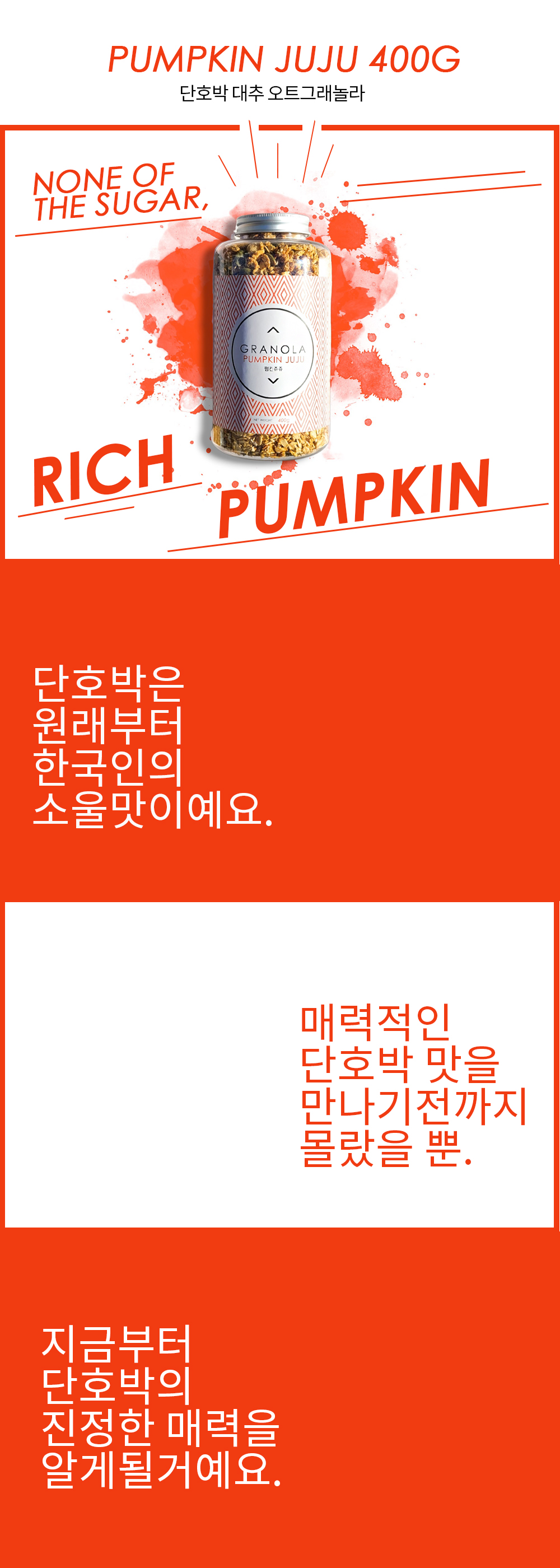 부드럽고 진한 단호박과 바삭달큰한 건대추, 부드러운 오트밀의 완벽한 조화. 설탕이 없어 더 맛있고 천연재료만으로 건강하게 만들었어요