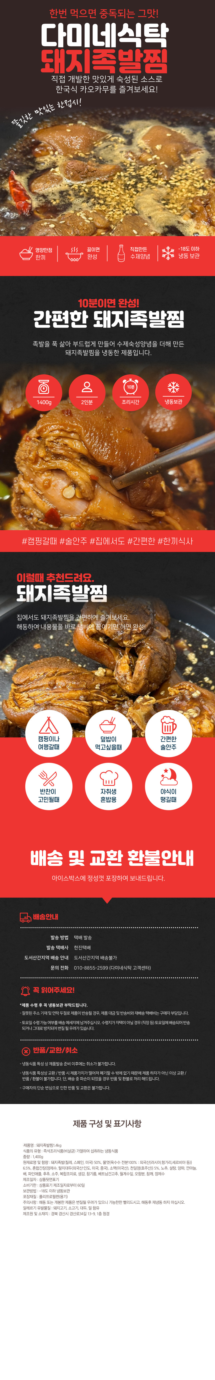 돼지족발(칠레, 스페인, 미국) 50%, 물엿{옥수수 전분100% : 외국산(러시아,헝가리,세르비아 등)} 6.5%, 혼합간장{정제수, 탈지대두(외국산:인도, 미국, 중국), 소맥(미국산), 천일염(호주산)} 5%, 노추, 설탕, 양파, 깐마늘, 배, 파인애플, 후추, 소주, 복합조미료, 생강, 참기름, 베트남건고추, 월계수잎, 오향분, 참깨, 정제수 제조일자 : 상품뒷면표기