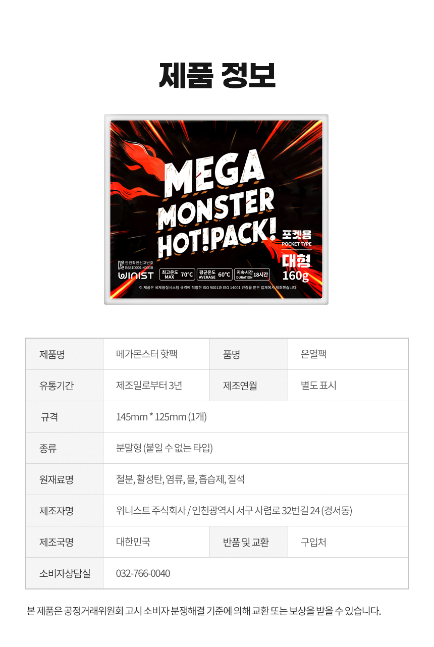 • 메가몬스터 대용량 핫팩 160g 대형 포켓형
