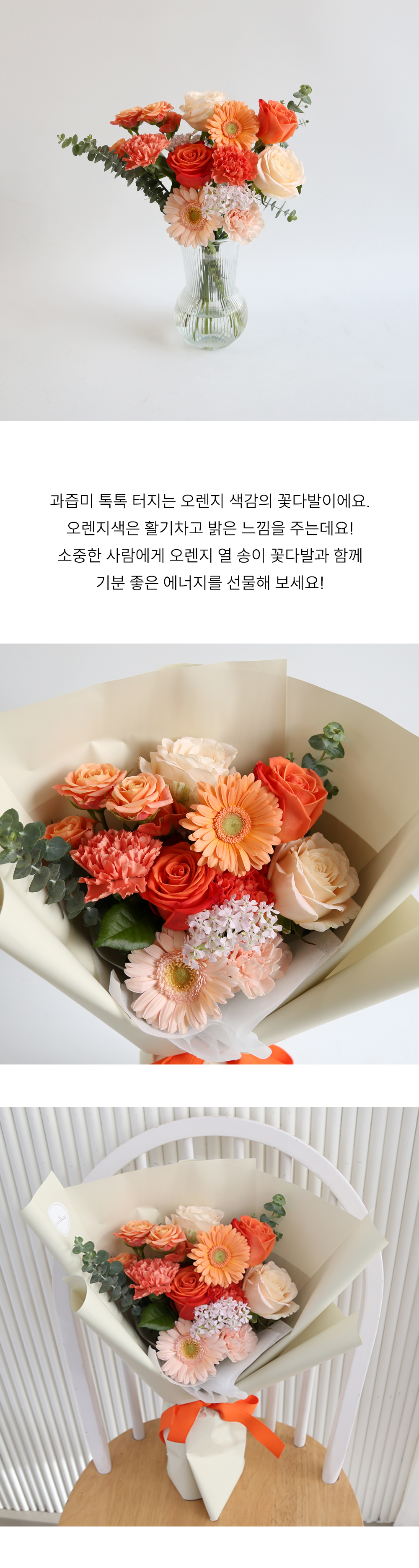 과즙미 톡톡 터지는 오렌지 색감의 꽃다발이에요. 기분 좋은 에너지를 선물해 보세요! 플로라운지에서 프리미엄 꽃배송을 즐겨보세요.