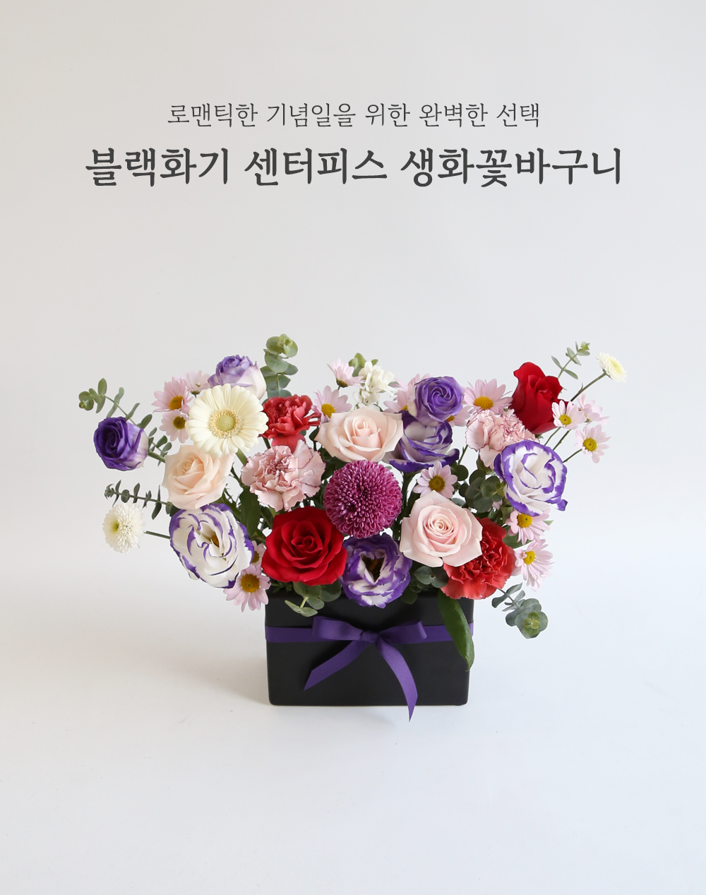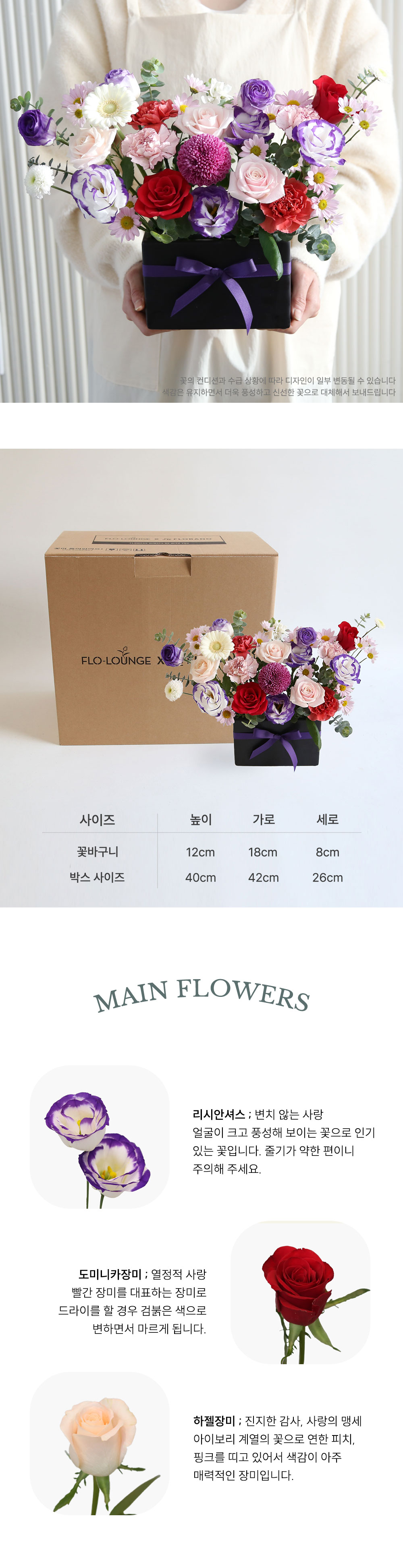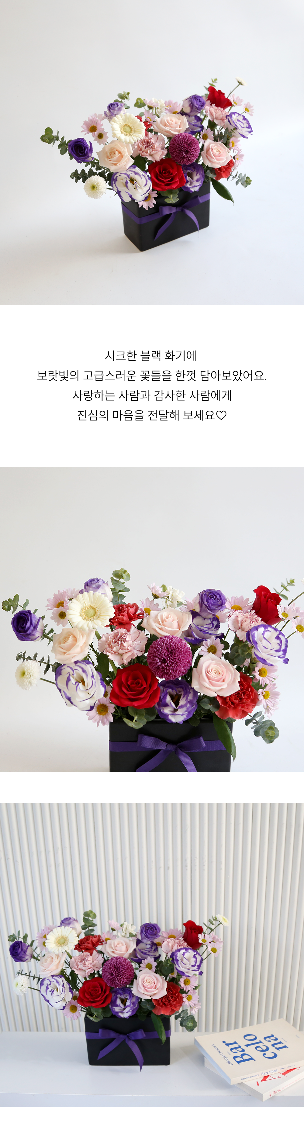 시크한 블랙 화기에 보랏빛의 고급스러운 꽃들을 한껏 담아보았어요. 플로라운지에서 프리미엄 꽃배송을 즐겨보세요.