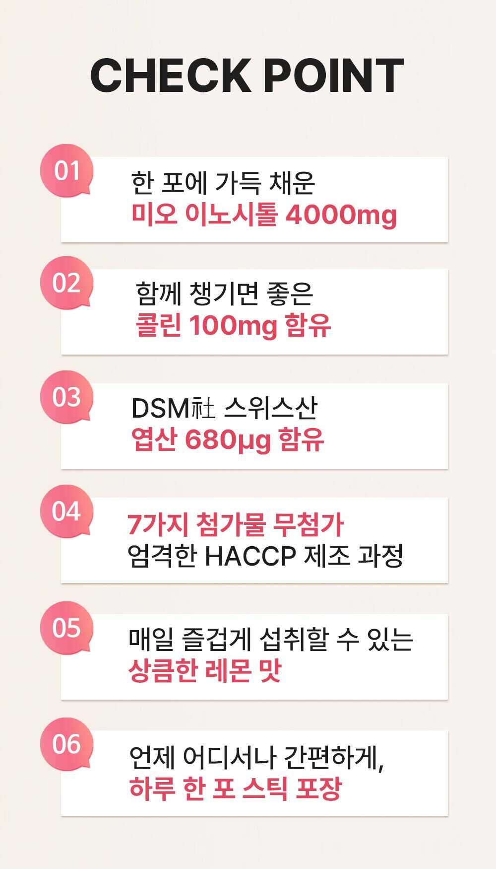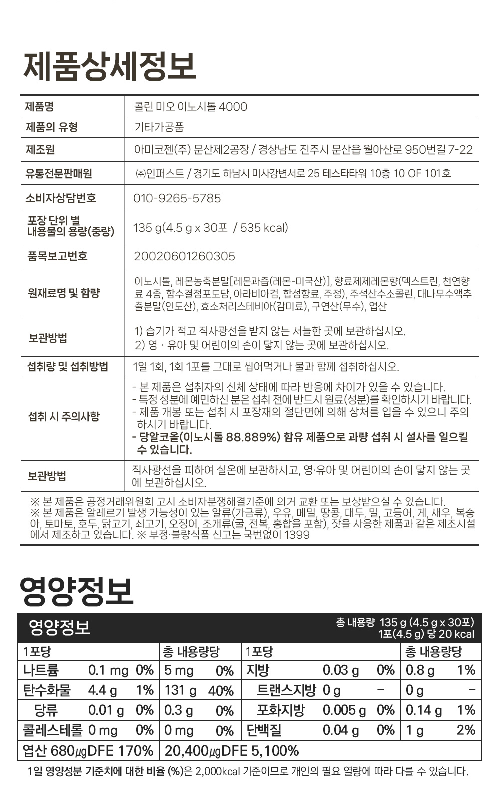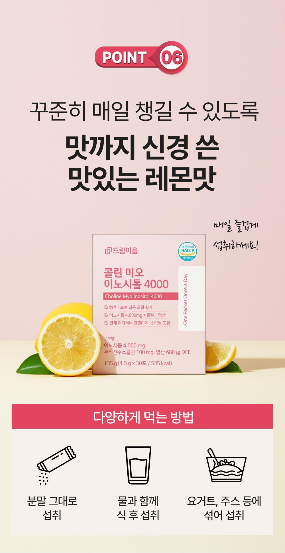 이노시톨, 레몬농축분말[레몬과즙(레몬-미국산)], 향료제제레몬향(덱스트린, 천연향료 4종, 함수결정포도당, 아라비아검, 합성향료, 주정), 주석산수소콜린, 대나무수액추출분말(인도산), 효소처리스테비아(감미료), 구연산(무수), 엽산