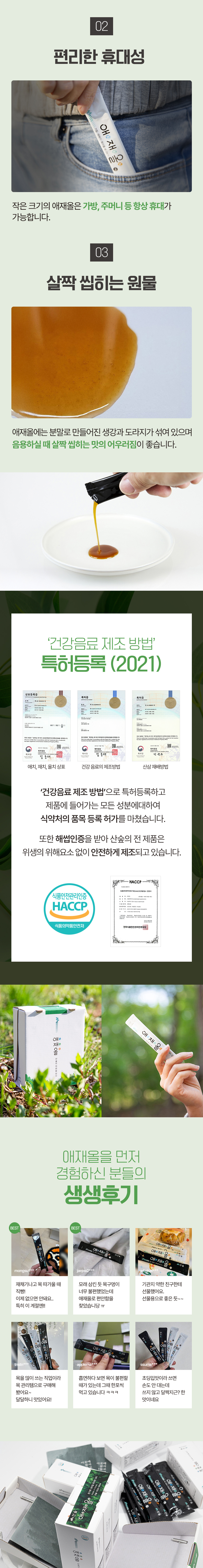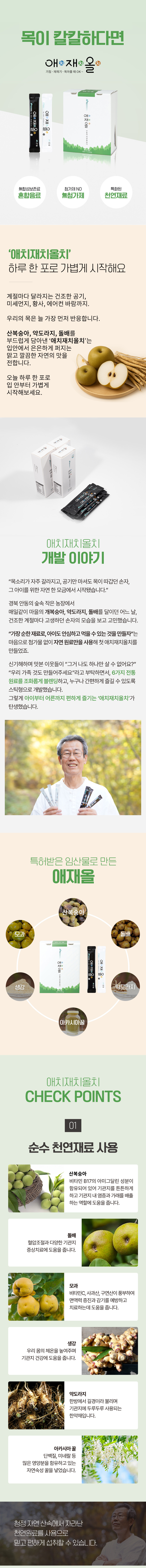 국내산 6가지 원료를 HACCP 인증 시설에서 저온 숙성해 만든 애재올, 하루 한 포로 목을 편안하게 케어하세요.