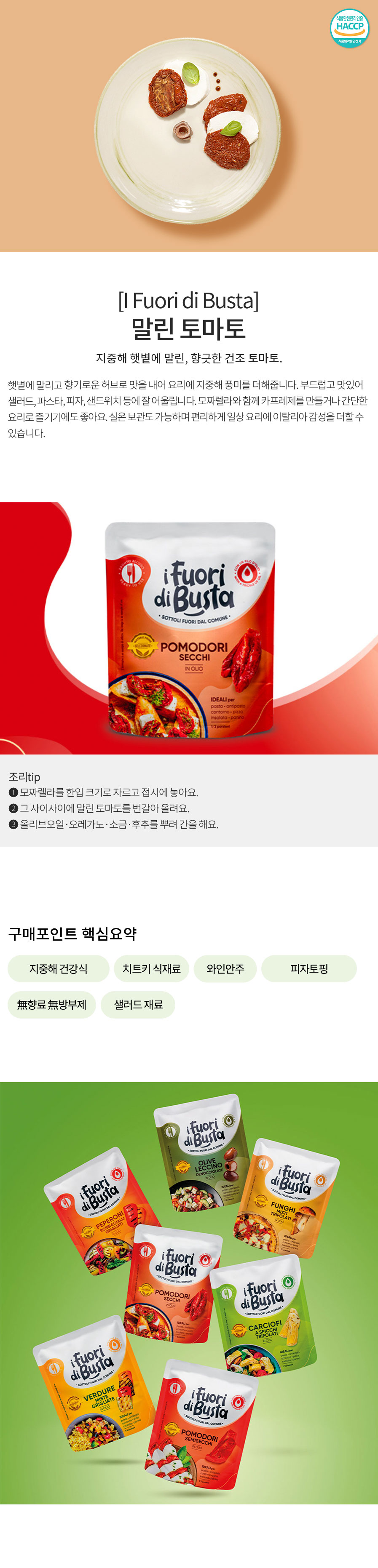 수화건조토마토 90%, 해비라기오일 7%, 식염, 건조마늘량 0.18%, 건조양파 0.18%, 건초오레가노, 건파슬리 0,02%, 비타민C, 구연신