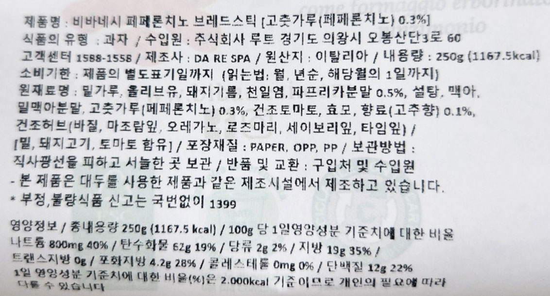 밀가루, 올리브유, 돼지기름, 천일염, 파프리카분말 0.5%, 설탕, 맥아, 밀맥아분말, 고춧가루(페페론치노) 0.3%, 건조토마토, 효모, 향료(고추향) 0.1%, 건조허브(바질, 마조람잎, 오레가노, 로즈마리, 세이보리잎, 타임잎)/ [밀, 돼지고기, 토마토 함유]
