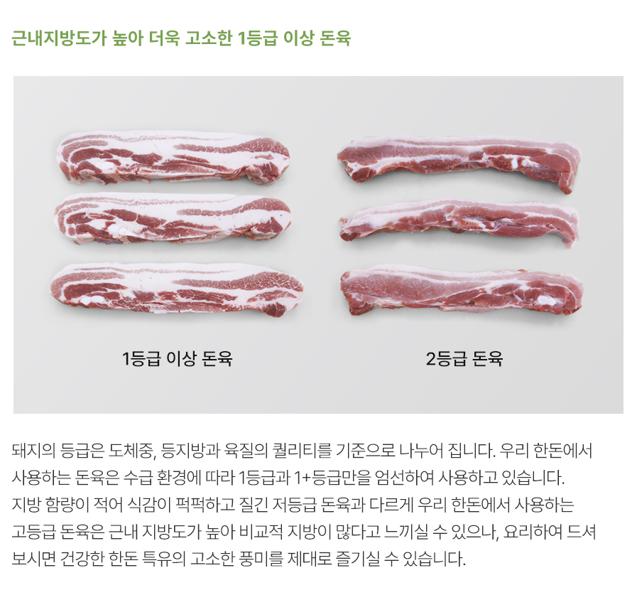본 상품은 1등급 이상 원육만 선별하여 가공되는 상품으로 근내지방도(마블링)가 높고, 지방층이 두터운 것이 특징입니다. 지방이 많다고 느끼실 수 있으나 지방의 녹는점이 낮고 조직이 연해 단순한 지방이 아닌 고기 전체를 코팅해주는 육즙 주머니로 요리하여 드셔보시면 고소함을 느끼실 수 있습니다. (등급이 낮은 고기일수록 육안으로는 살코기가 많아 보이지만 지방이 적고 퍽퍽합니다)