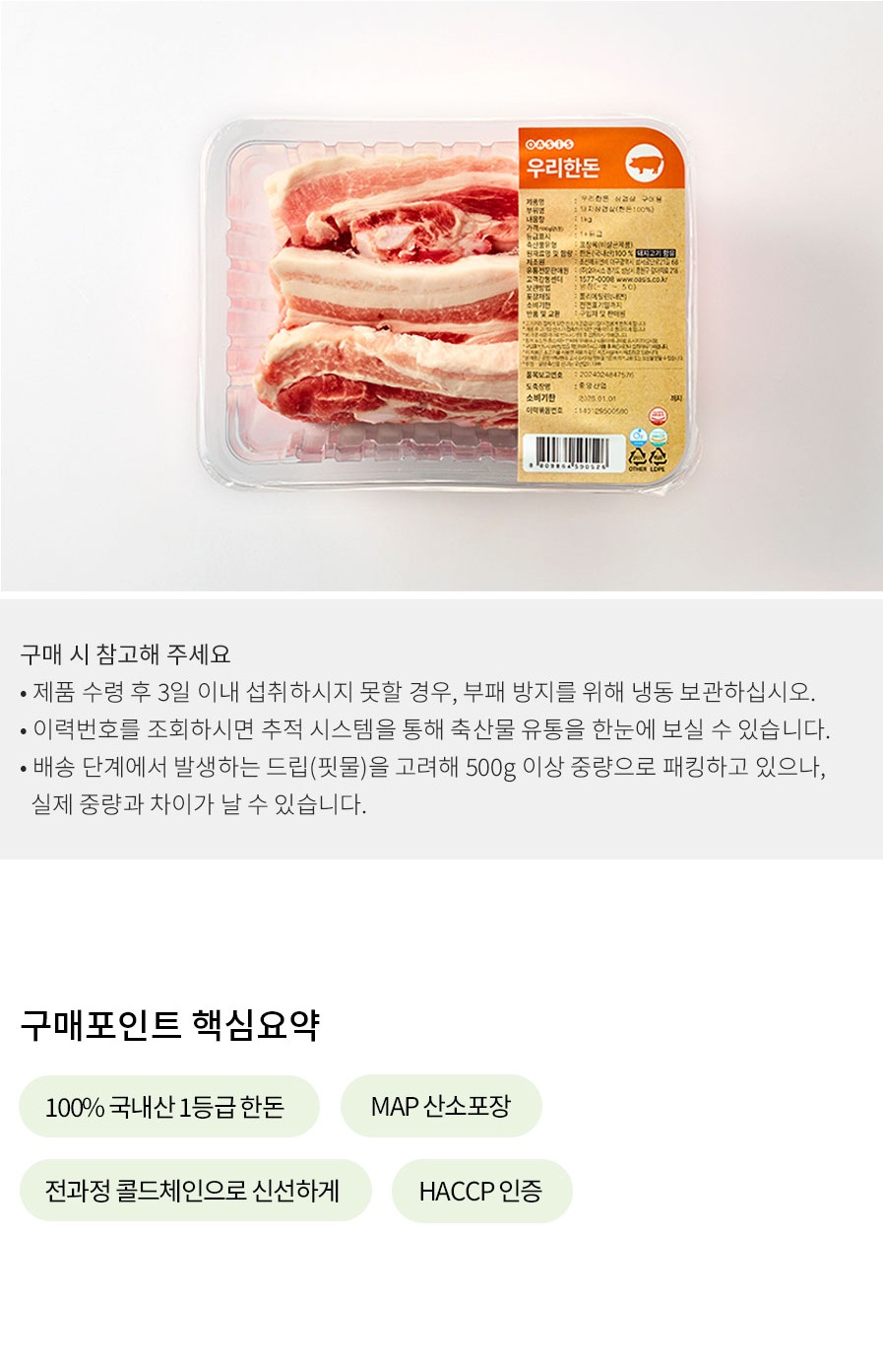 - 이력번호를 조회하시면 추적 시스템을 통해 축산물 유통을 한 눈에 보실 수 있습니다. - 외부 산소가 차단되어 고기가 검붉게 보일 수 있습니다. - 포장 제거 15~30분 후에는 산소를 만나 다시 선홍빛으로 돌아옵니다. - 도축일이 가까운 신선한 돈육일수록 붉은 색을 띕니다. 이는 신선한 돈육이니 안심하시고 섭취하셔도 됩니다. - 생산물 배상 책임 보험 가입 : PL보험에 가입되어 만에 하나 가공 또는 유통 중 식품안전 관련 사고 발생 시 사고 당 최대 10억까지 배상이 가능합니다. - 배송 단계에서 발생하는 드립(핏물)을 감안하여 500g 이상 중량으로 패킹하고 있으나, 실제 중량과 차이가 날 수 있습니다.