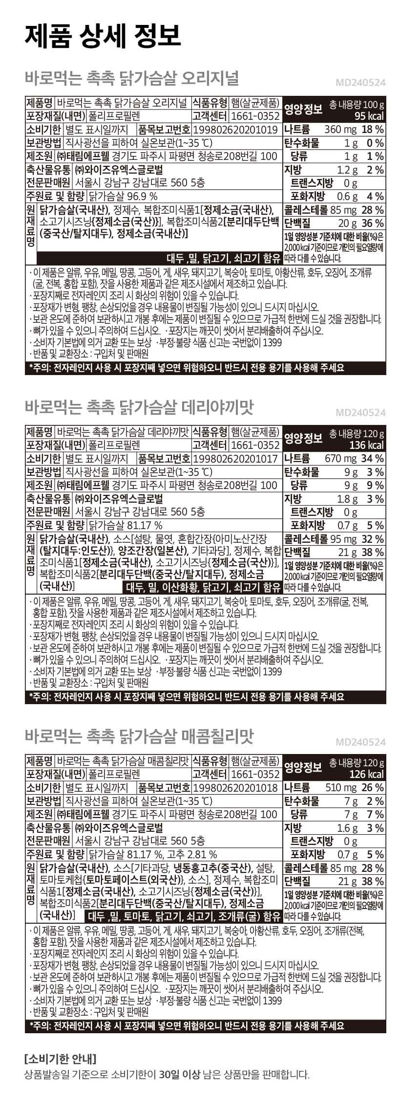 [실온보관] 바로먹는 촉촉 닭가슴살 3종 15팩(오리지널/데리야끼/매콤칠리)