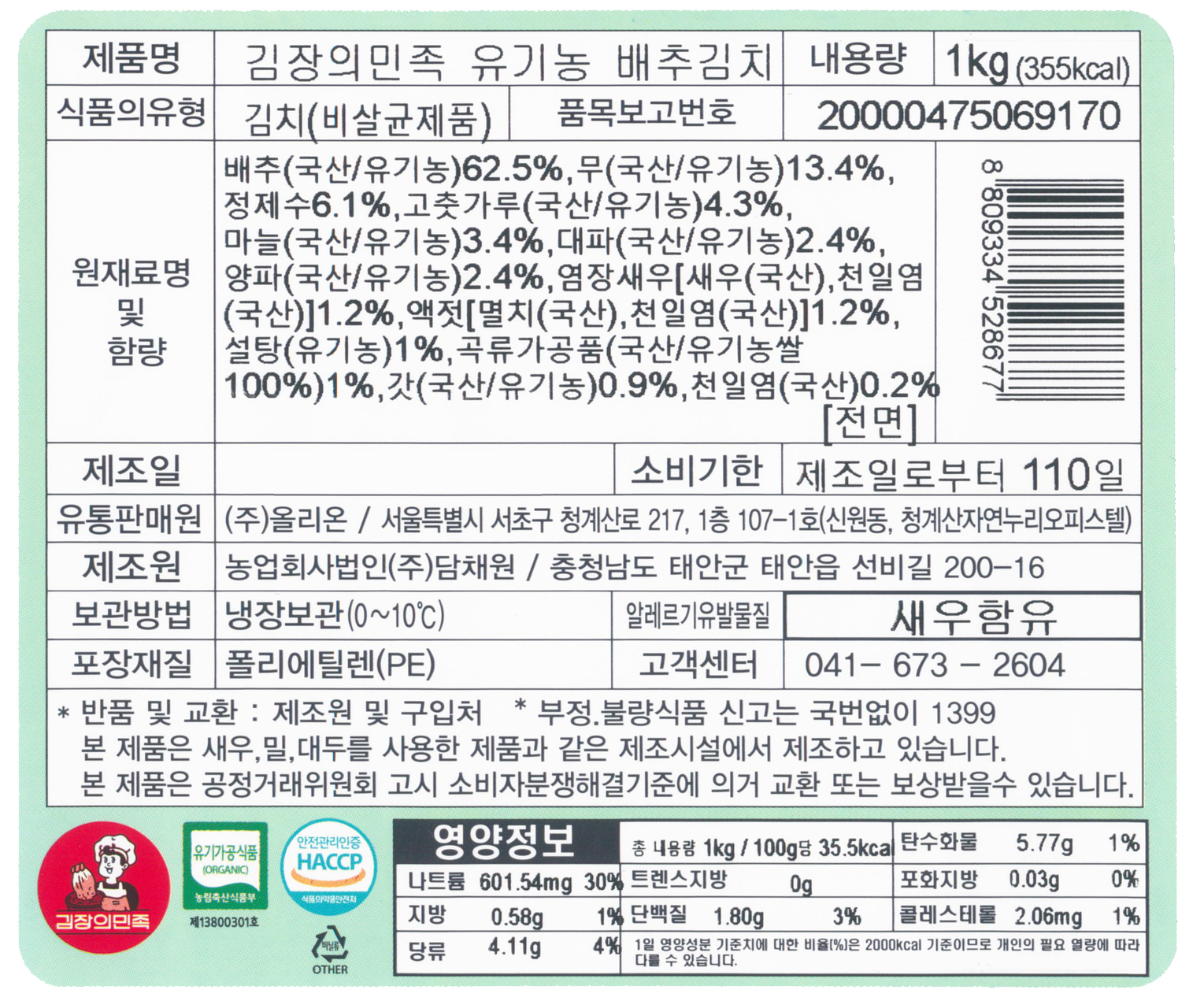 김장의민족 유기농 배추김치 1kg