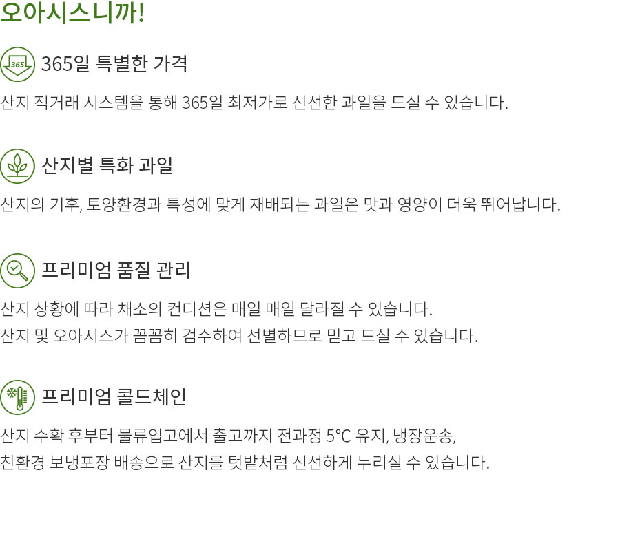 신선식품은 취급이 까다로워 전자상거래 업계에서 비중이 적으나 저희 오아시스는 고객님께 건강하고 신선한 제품을 제공하기 위한 고집을 지키기 위해 전체 상품중 신선 식품의 비중을 전제품의 70% 이상으로 유지하여 다양한 신선식품을 제공해 드립니다.