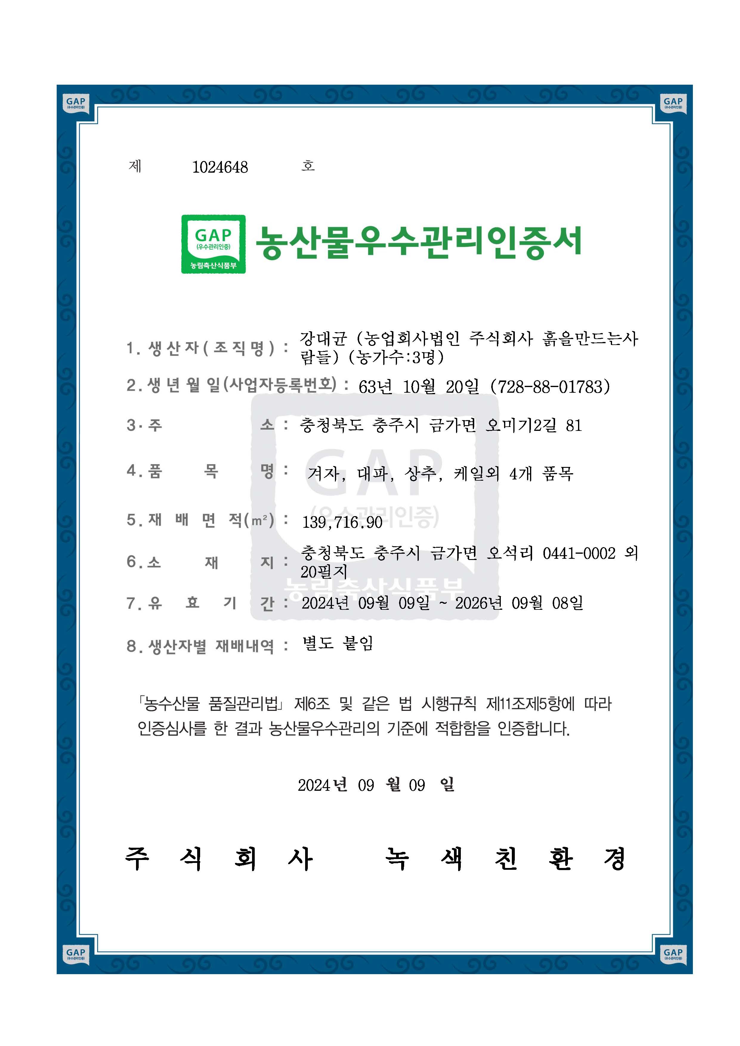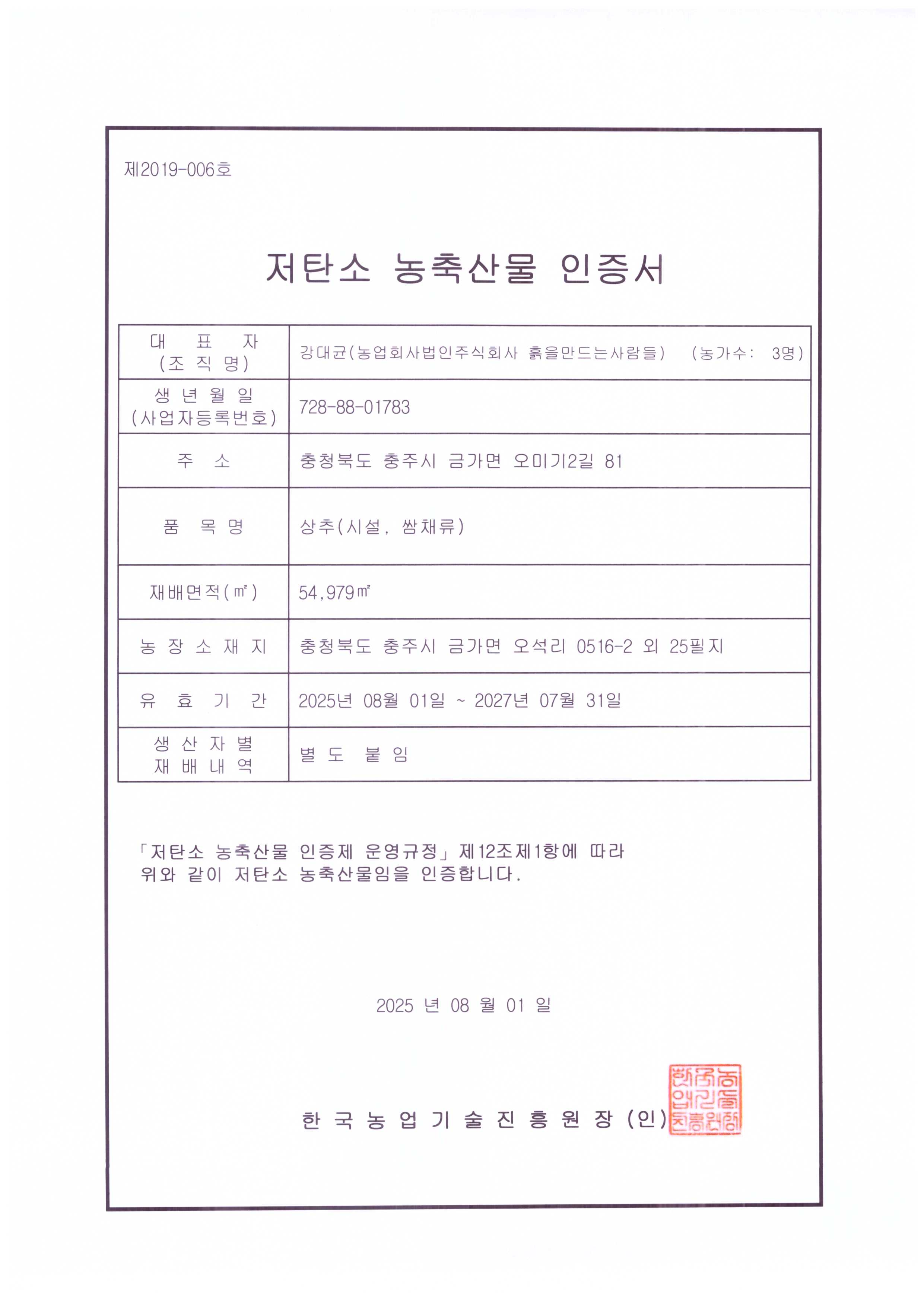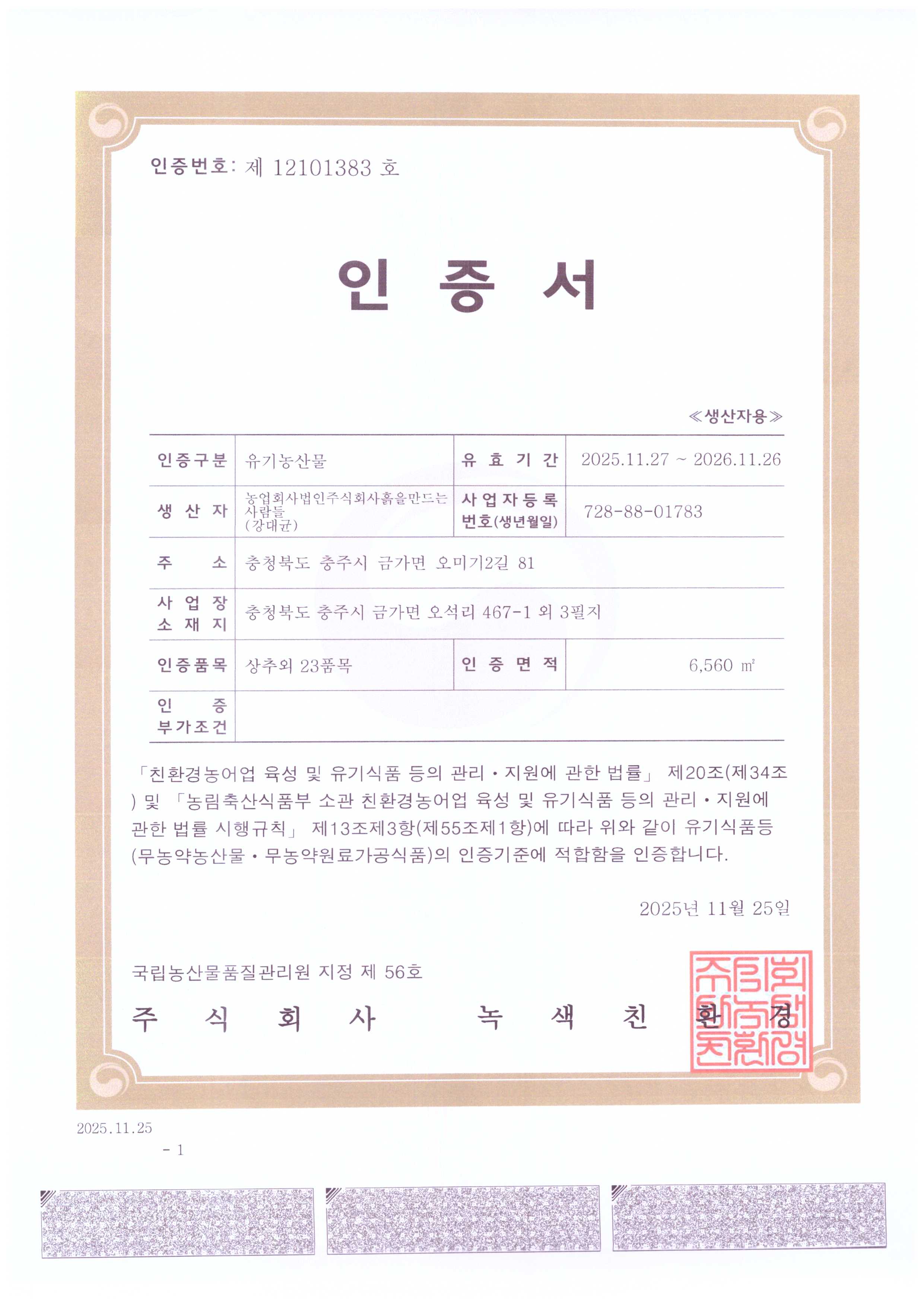 유기농 인증번호 제 12101383호 GAP 인증번호 제 1024648호 저탄소