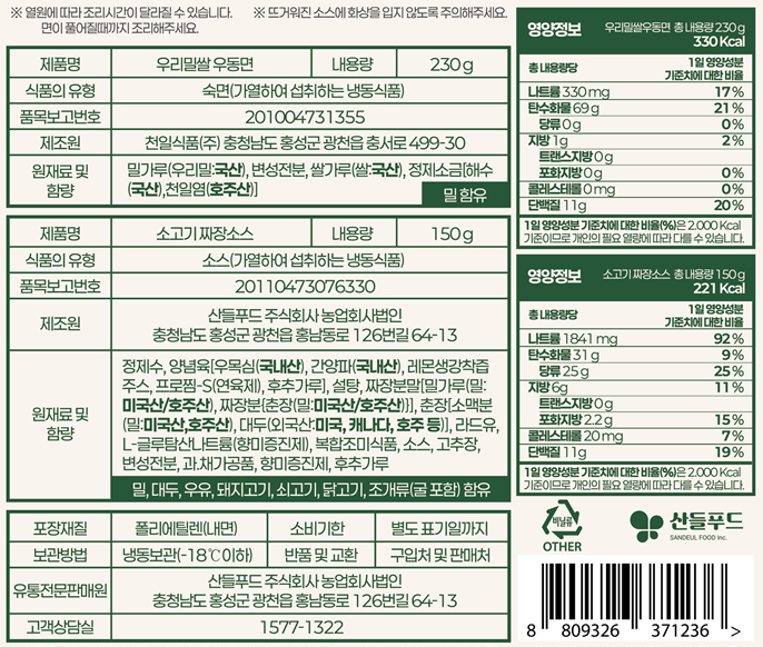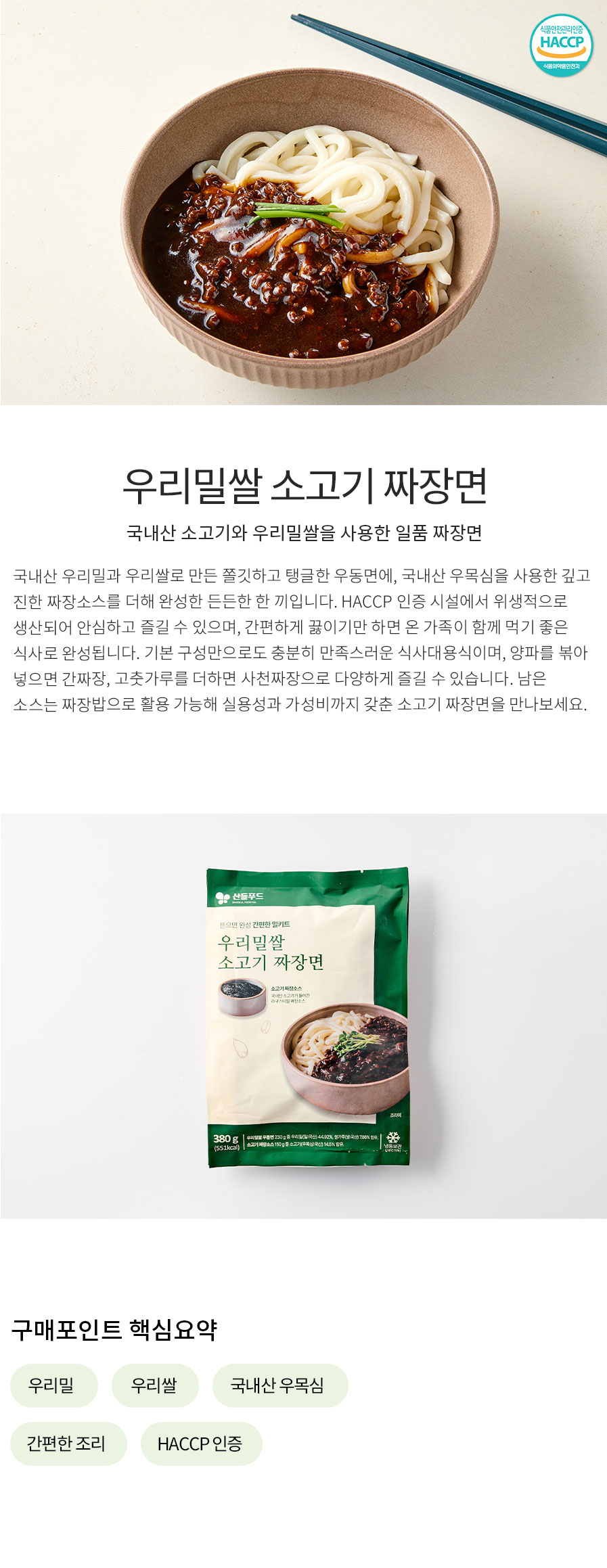 1. 국내산 우리밀과 우리쌀을 사용한 우동면과 국내산 우목심을 사용해 만든 짜장소스로 든든한 한끼를 즐길 수 있는 제품