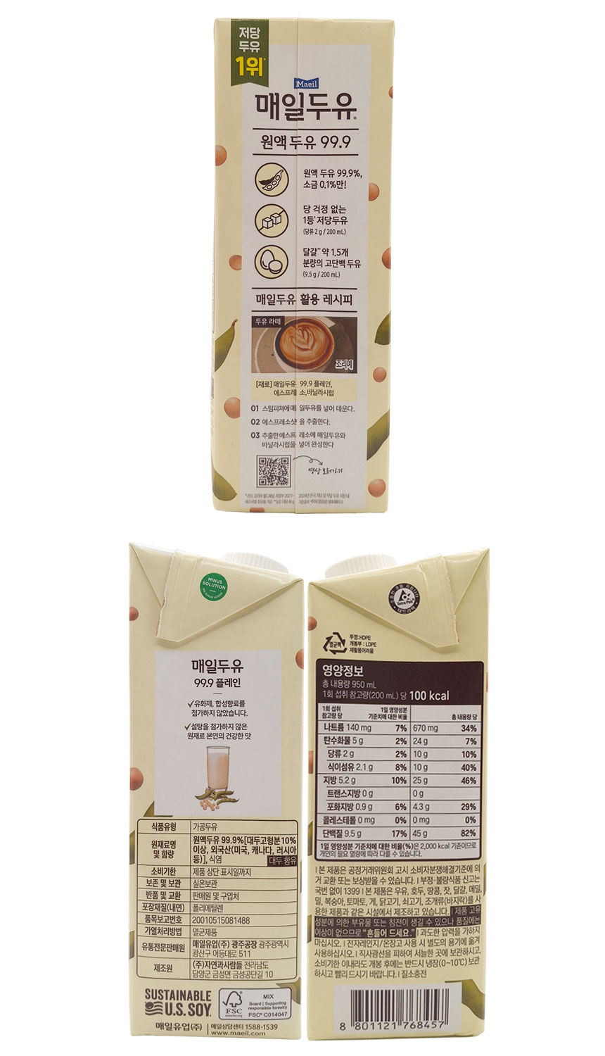 190ml 기준 열량 95kcal, 탄수화물 4g-당류 1.2g, 단백질 9g, 지방 5g-포화지방 0.8g,트랜스지방 0g, 콜레스테롤 0mg, 나트륨 160mg