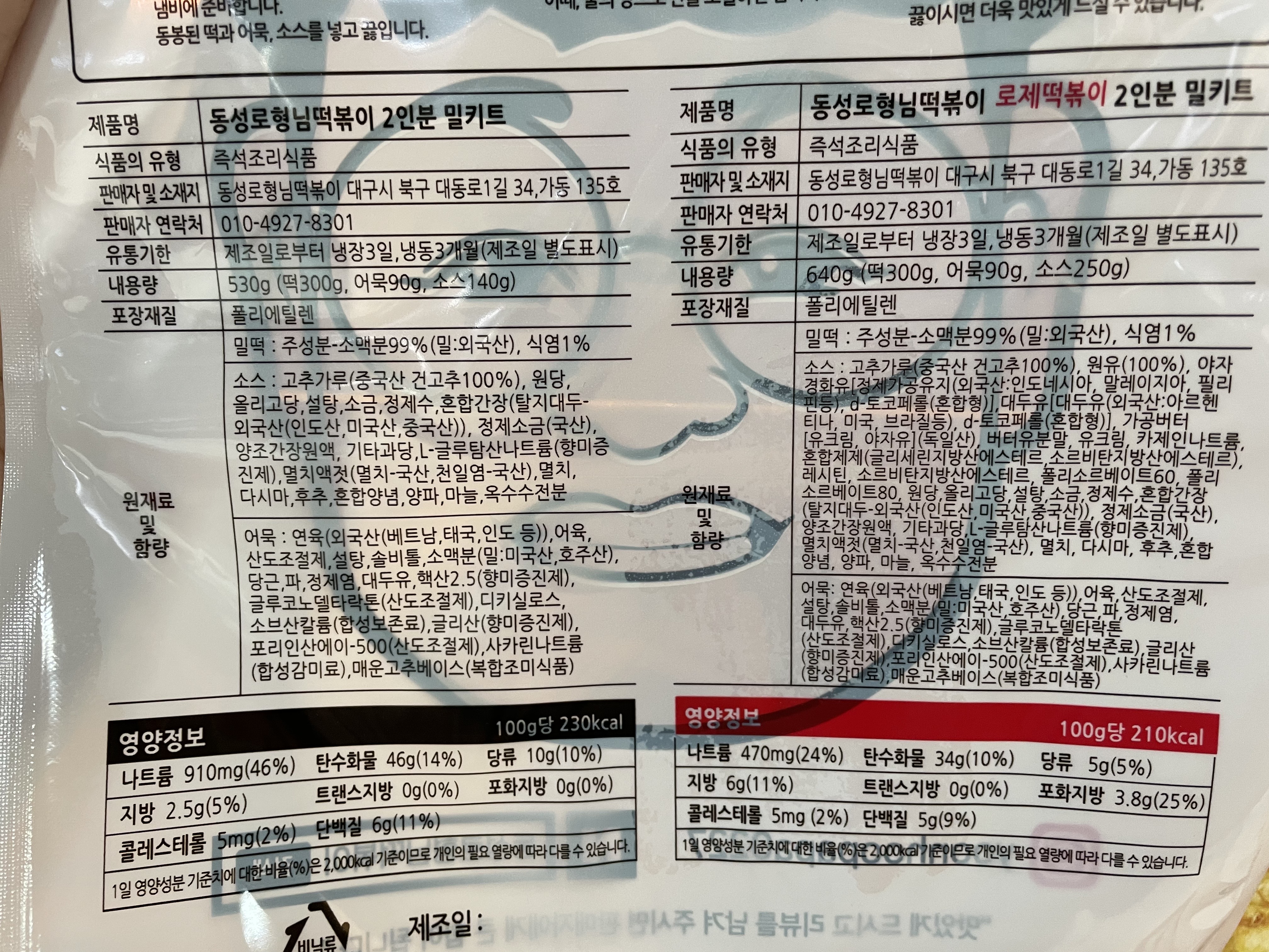 밀떡: 주성분-소맥분99%(밀:외국산),식염1% 소스: 고추가루(중국산 건고추100%),원당,올리고당,설탕,소금,정제수,혼합간장(탈지대두(외국산(인도산,미국산,중국산),정제소금(국산),양조간장원액,기타과당,L-글루탐산나트륨(향미증진제),멸치액적(멸치-국산,천일염-국산),멸치,다시마,후추,혼합양념,양파,마늘,옥수수전분 어묵: 연육(외국산(베트남,태국,인도 등),어육,산도조절제,설탕,솔비톨,소맥분(밀:미국산,호주산),당근,파,정제염,대두유,핵산2.5(향미증진제),글루코노델타락톤(산도조절제),디키실로스,소브산칼륨(합성보존료),글리산(향미증진제),포리인산에이-500(산도조절제),사카린나트륨(합성감미료),매운고추베이스(복합조미식품)