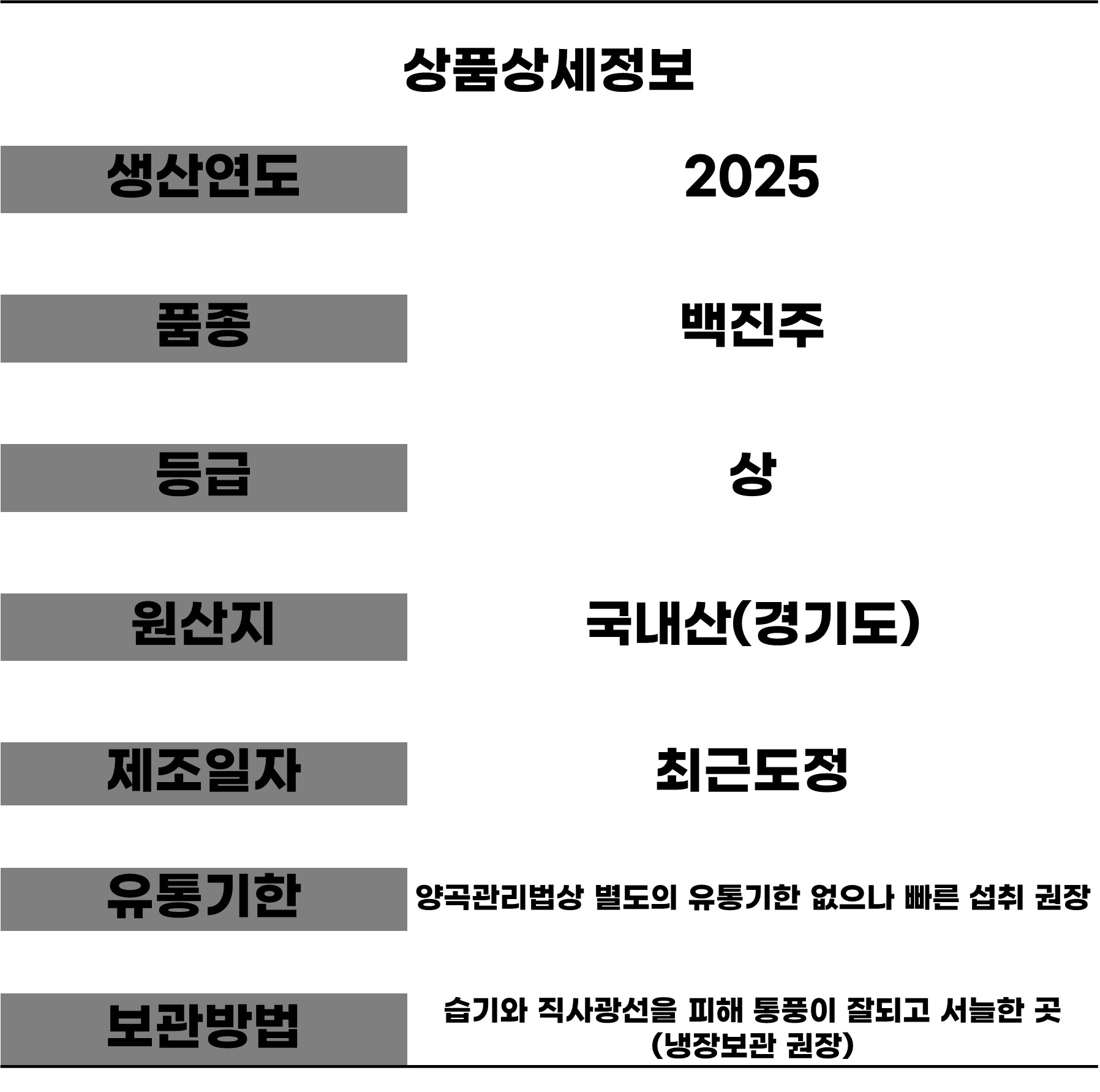 생산연도:2025년산 / 원산지 : 국내산 / 품종 : 백진주 / 등급 : 상