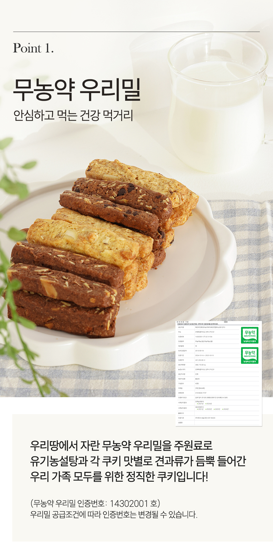 [無농약, HACCP, 국산, 우리밀, 無화학첨가, 無향미증진, 無색소, 無방부제]