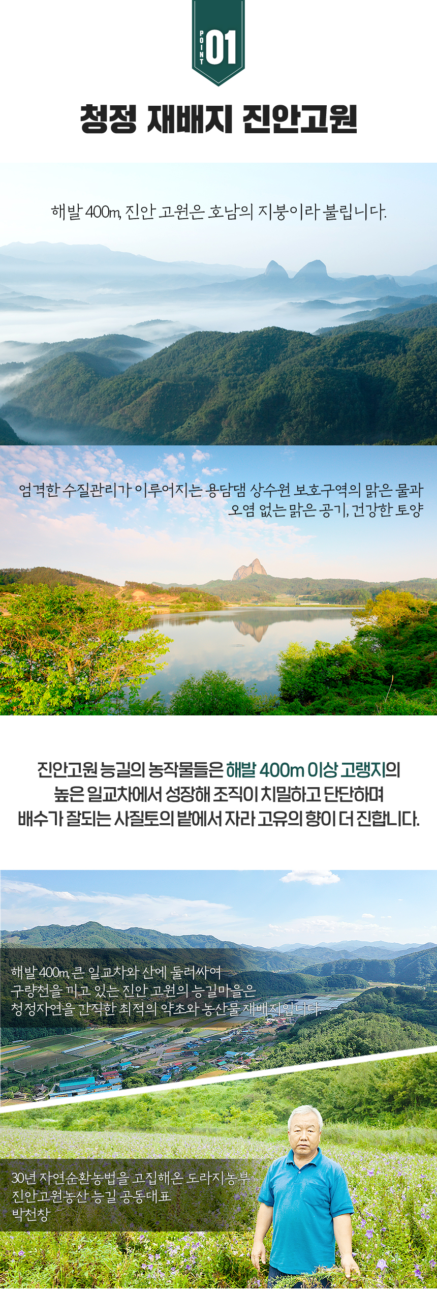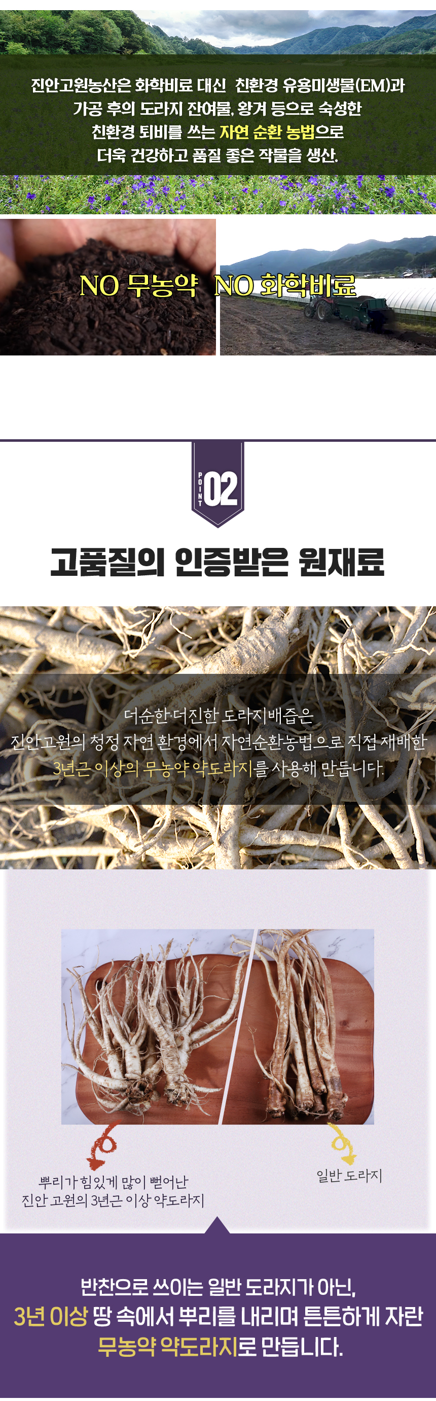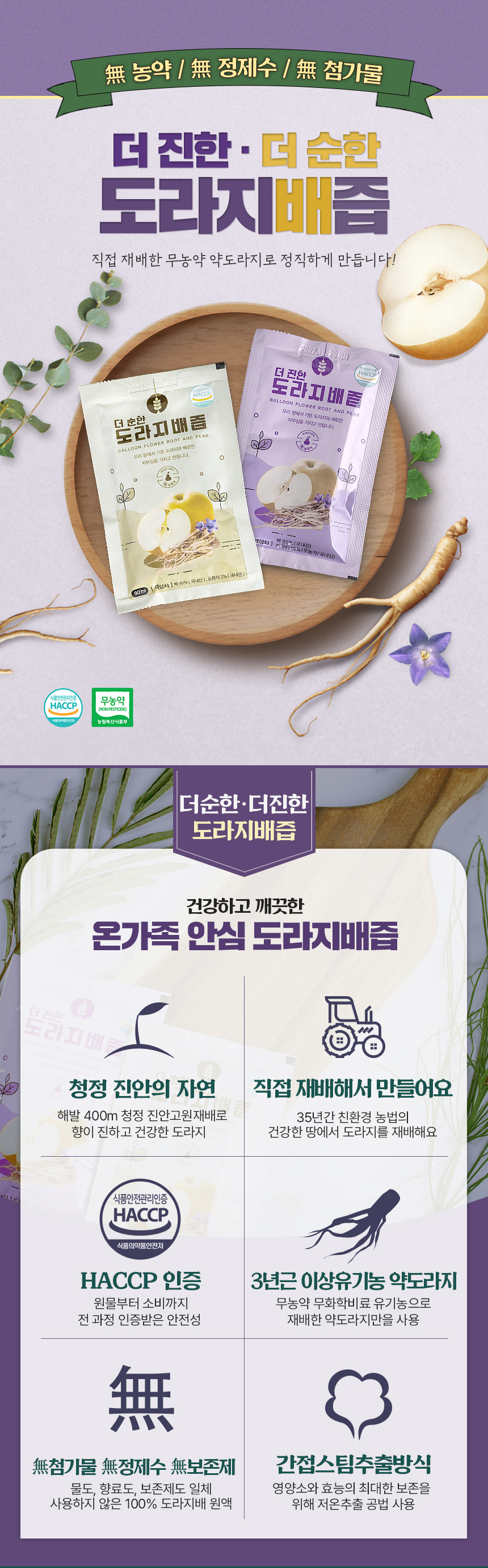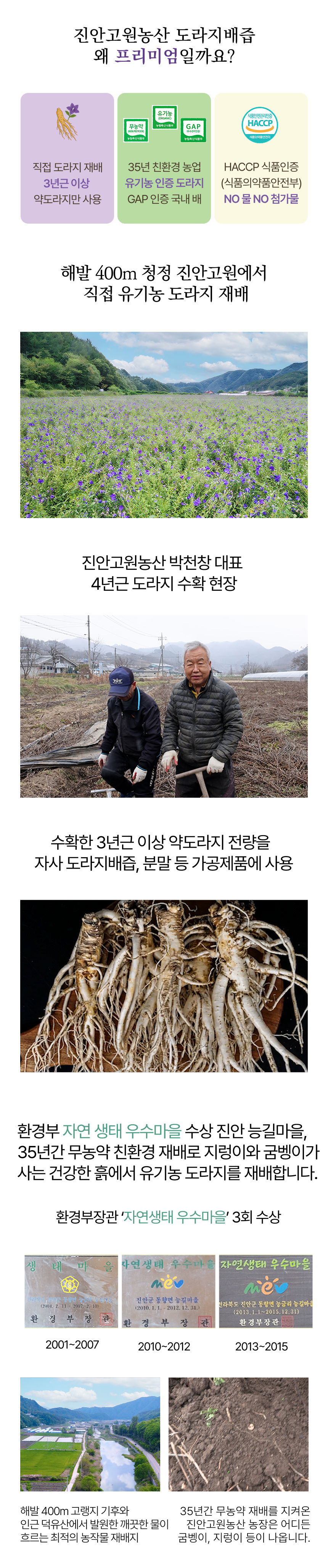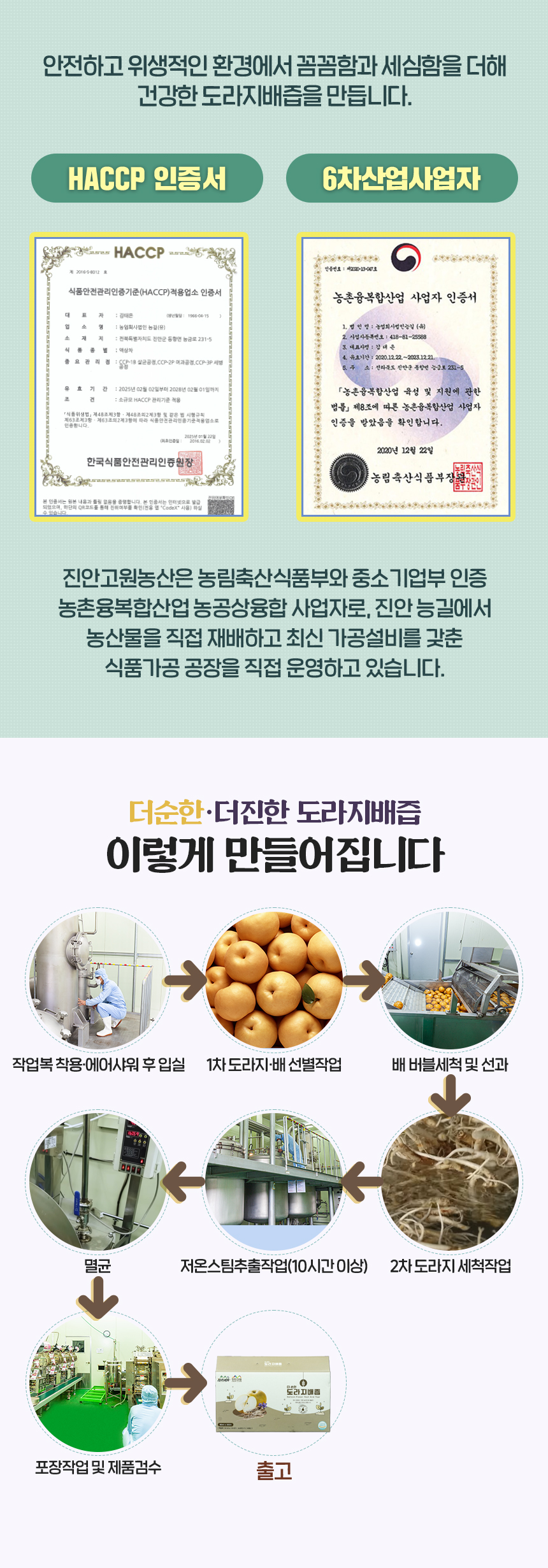 고원의 청정지역 진안 능길에서 무농약으로 직접 재배한 3년근 약도라지로 만든 친환경농산물과 HACCP 인증 제품으로 농림축산식품부와 중소벤처기업부장관 지정 농공상융합형중소기업