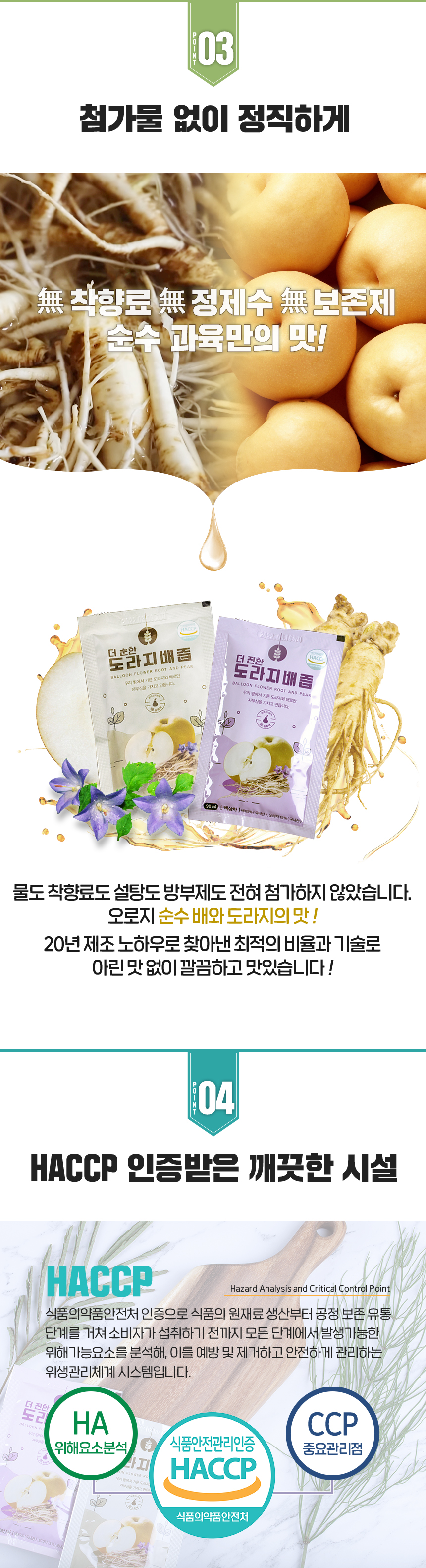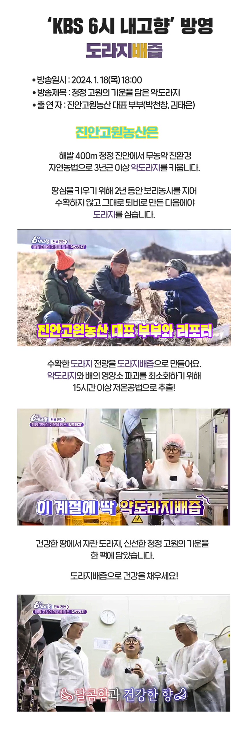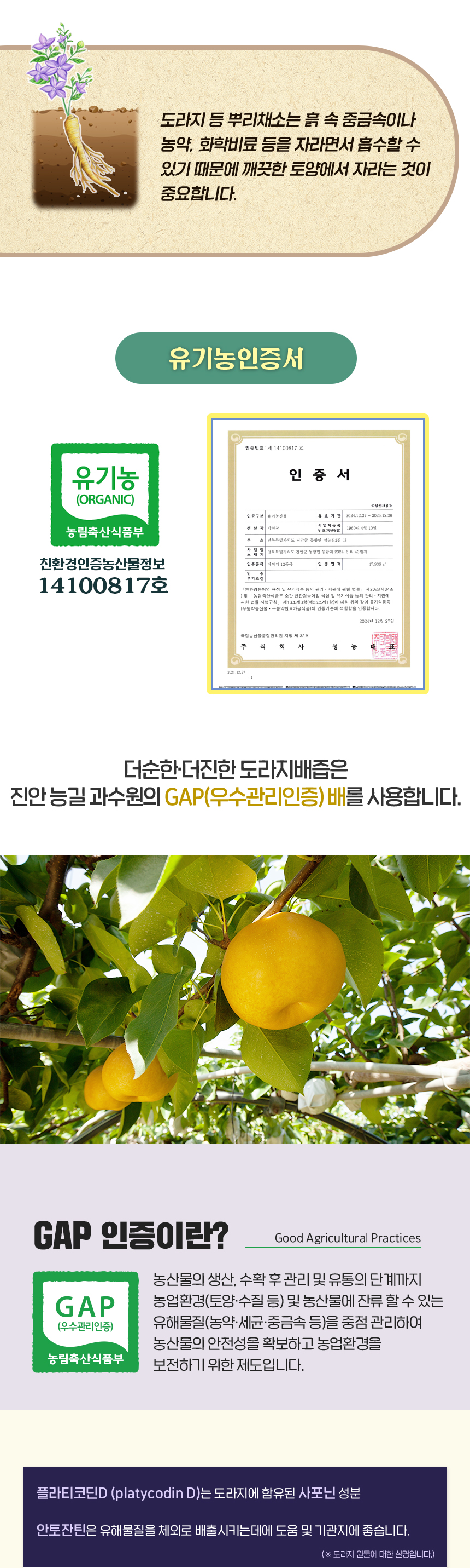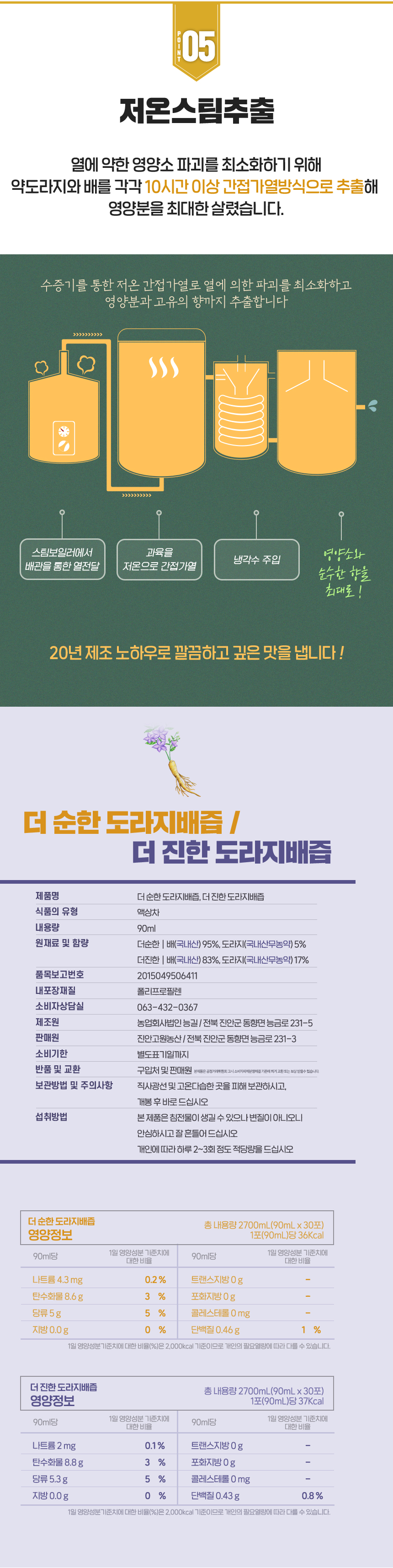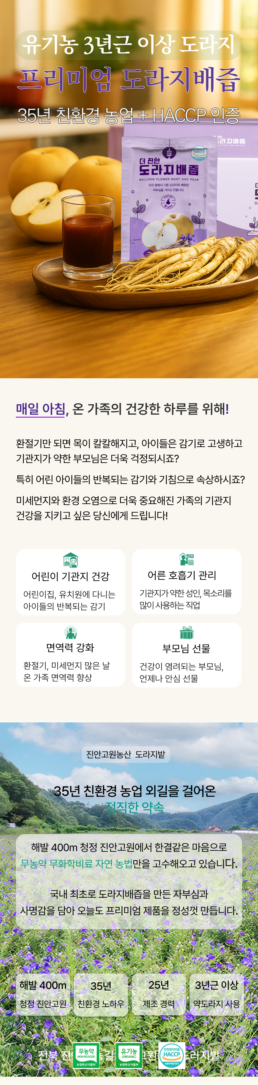 고원의 청정지역 진안 능길에서 무농약으로 직접 재배한 3년근 약도라지로 만든 친환경농산물과 HACCP 인증 제품으로 농림축산식품부와 중소벤처기업부장관 지정 농공상융합형중소기업