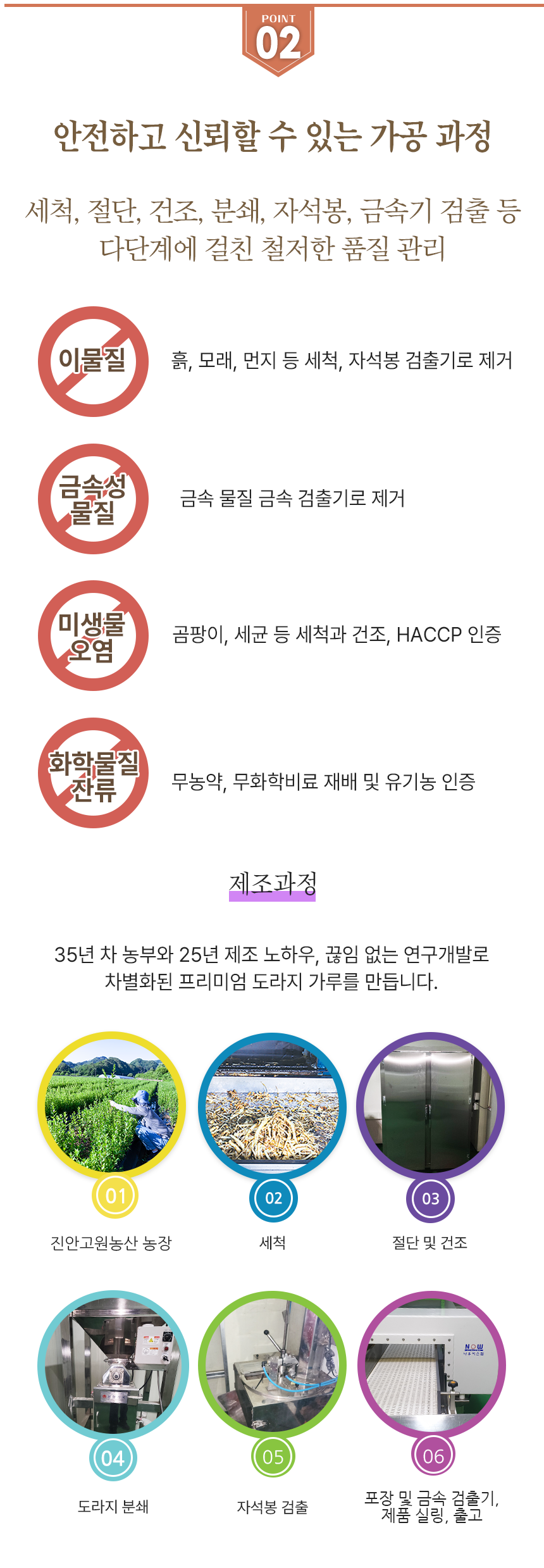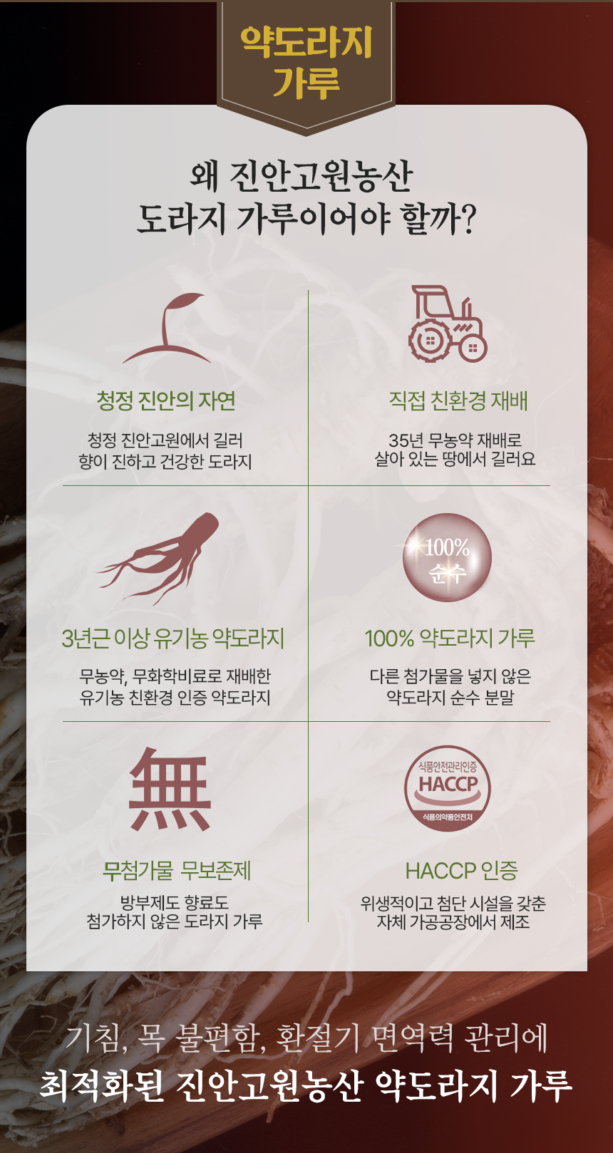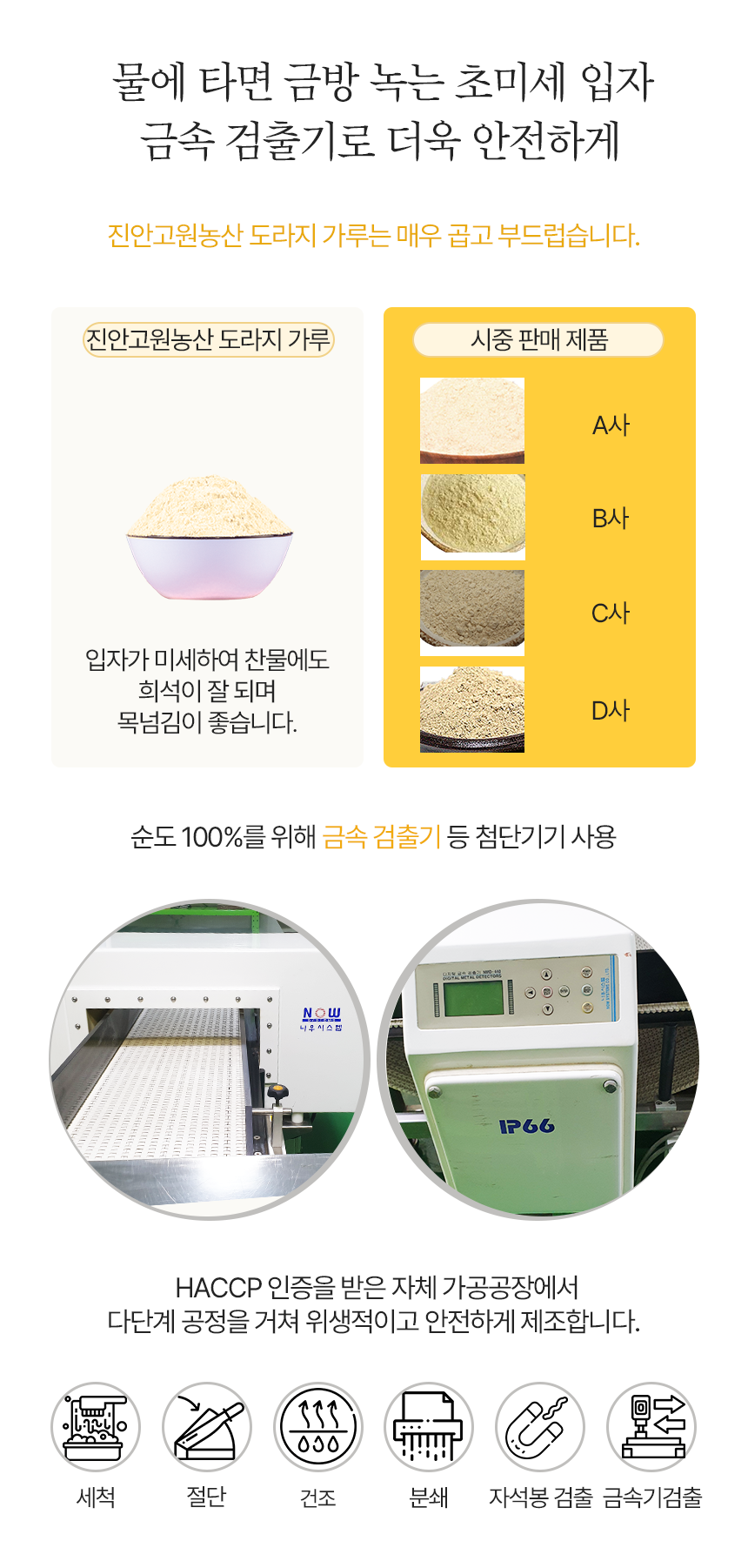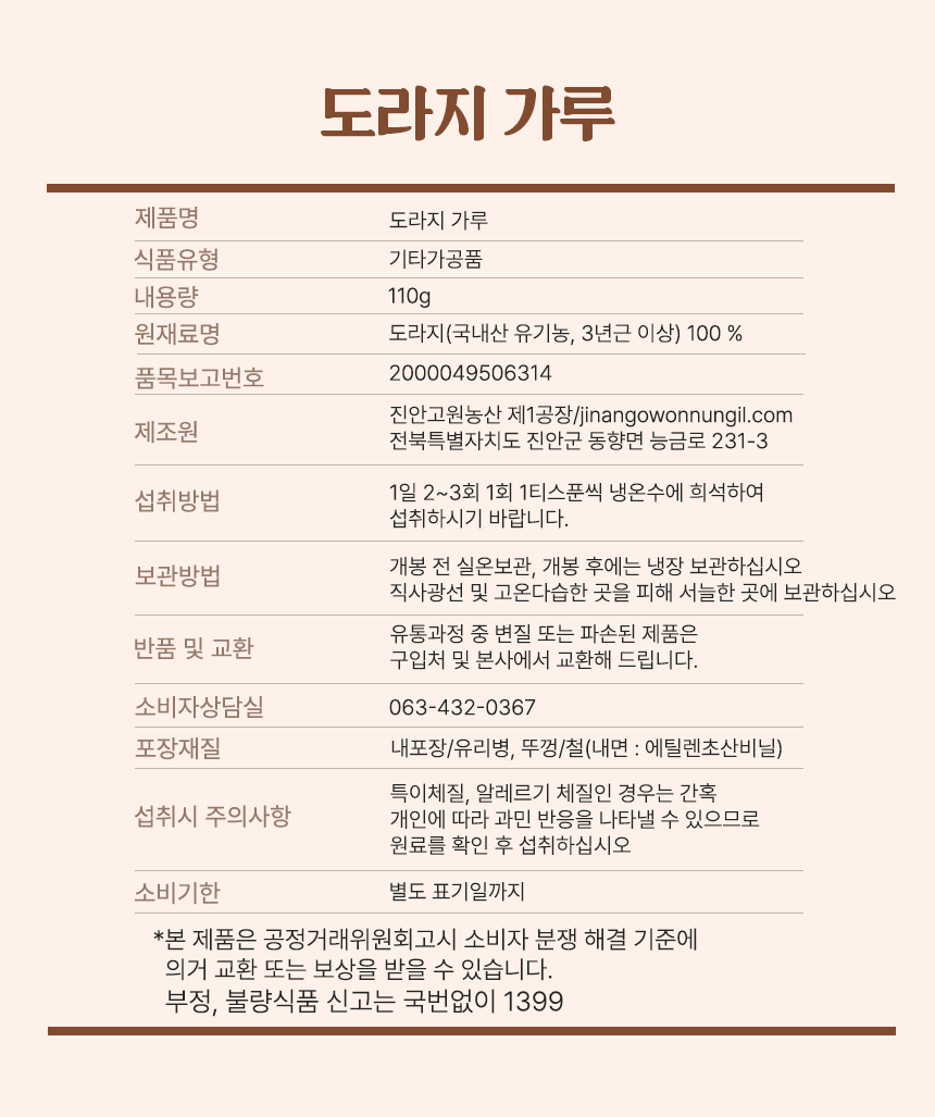 무농약으로 직접 재배한 3년근 약도라지 제품으로 자석봉, 금속검출기 등 미세 공정을 거친 HACCP 인증 순도 100% 도라지가루