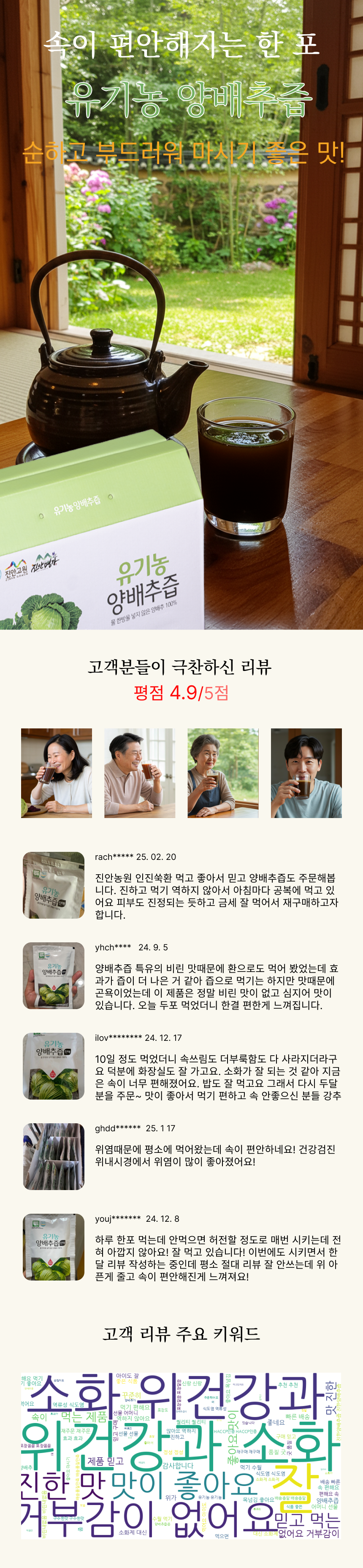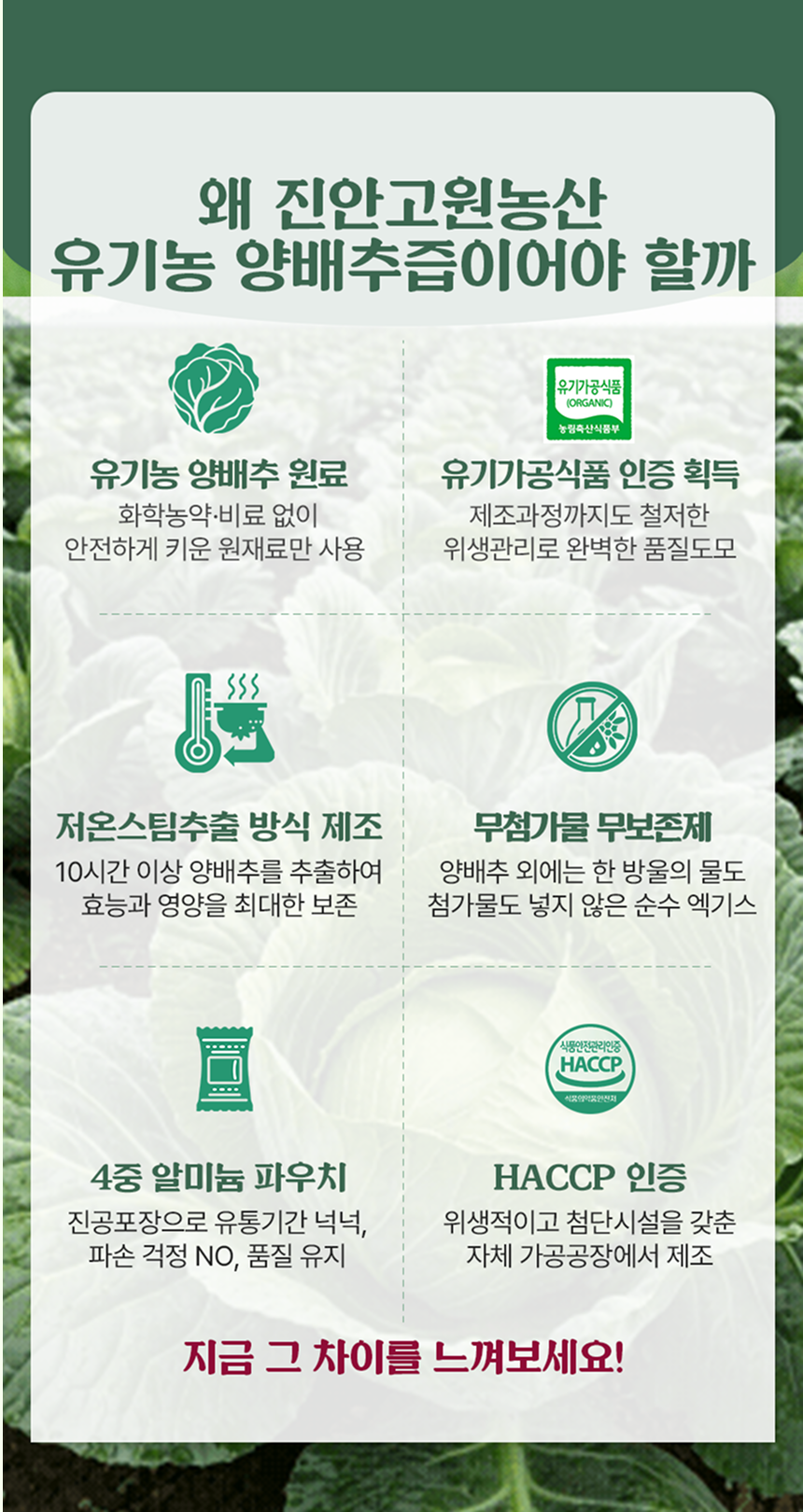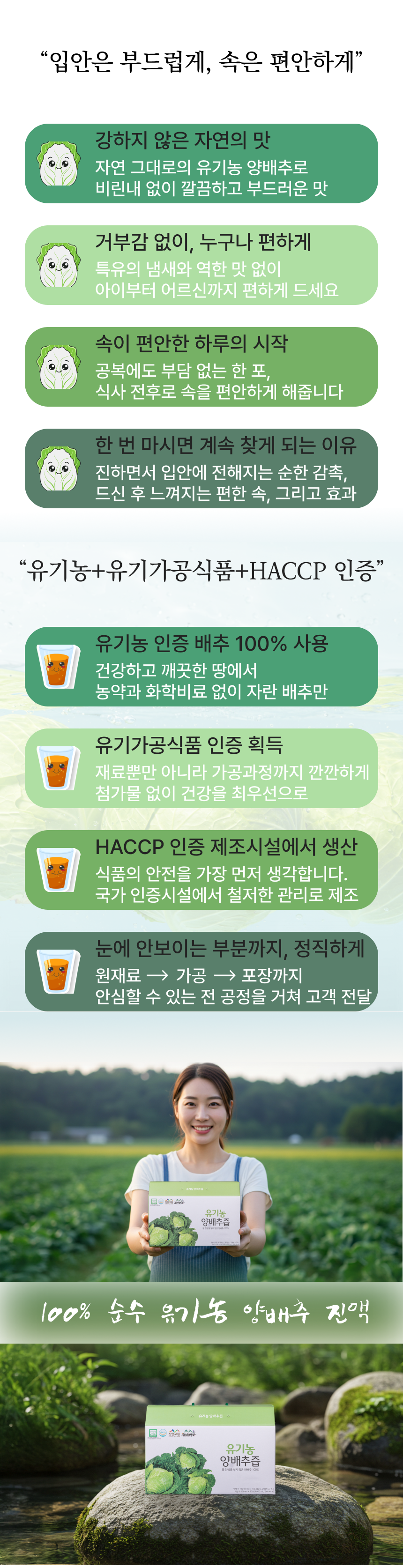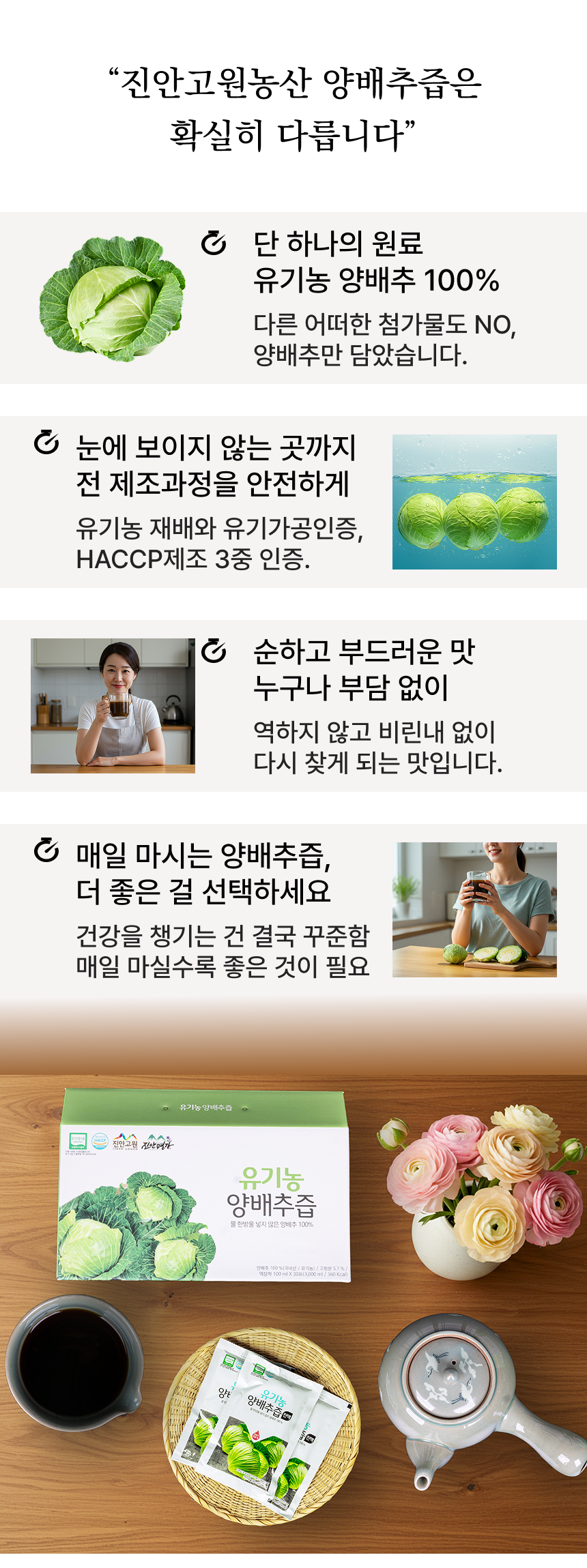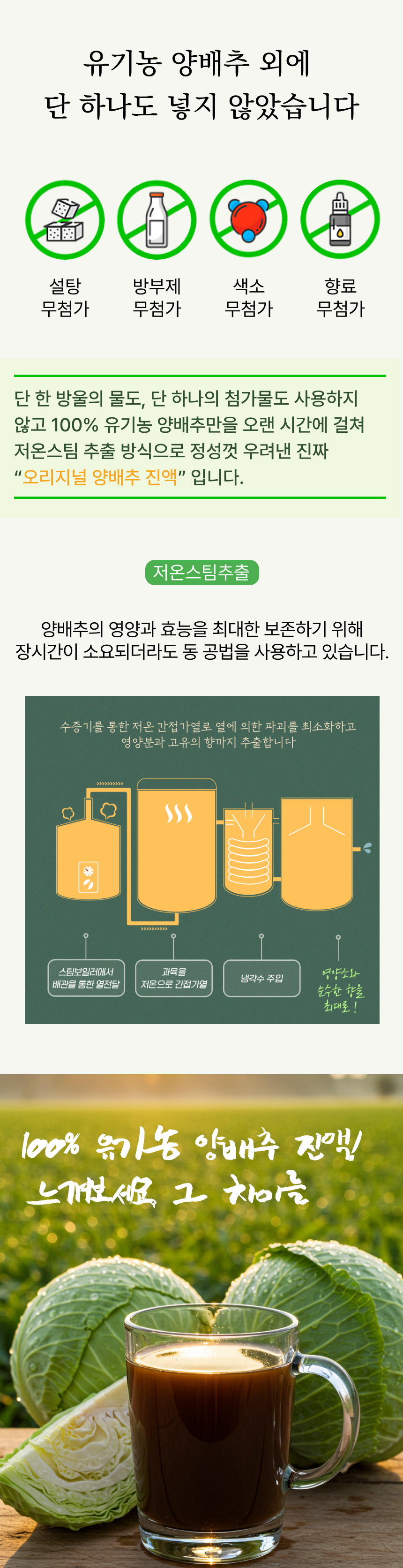물과 다른 첨가물을 타지 않은 순수 유기농 100% 양배추로만 만든 비린내 없는 양배추즙