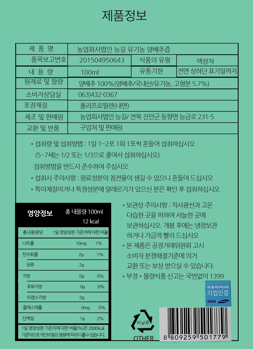 • 물과 첨가물을 넣지 않은 유기농 100% 양배추즙 100ml 30팩
