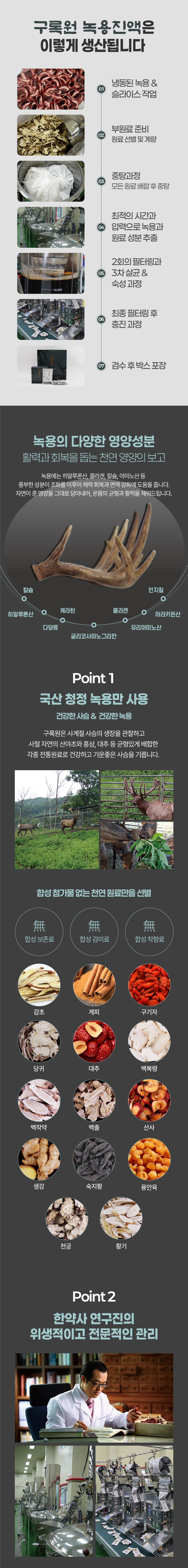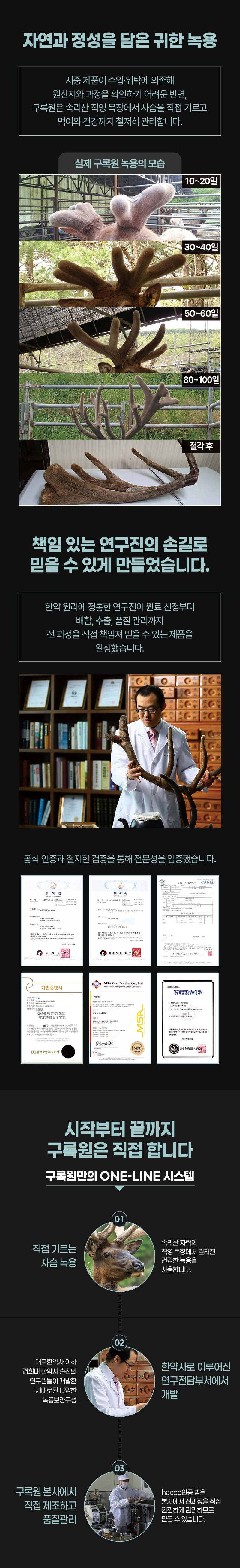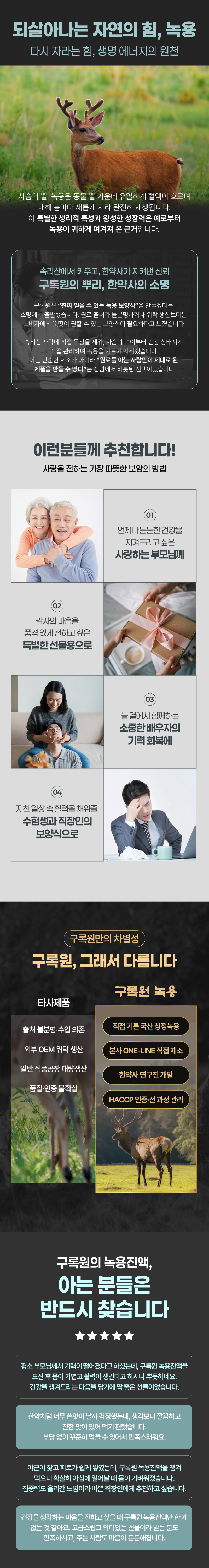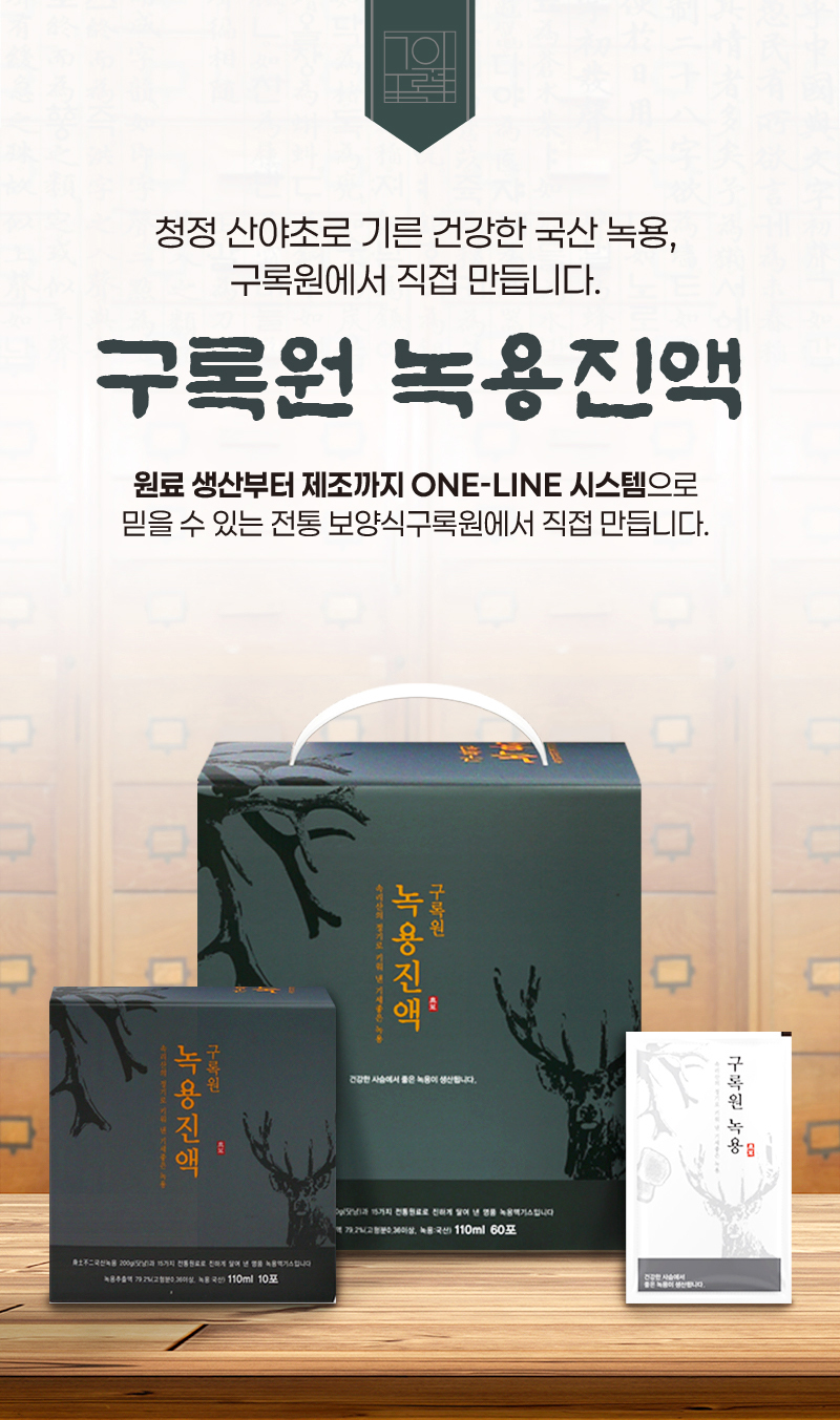 구록원 사슴목장에서 자란 건강한 사슴의 녹용 / 전통원료 15종과 조화된 정통녹용제품입니다.