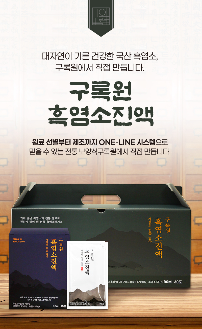 흑염소진액 국내산 청정흑염소와 고경원 대표한약사의 전통원료배합, 구록원의 중탕기술로 진하면서 깔끔한 맛