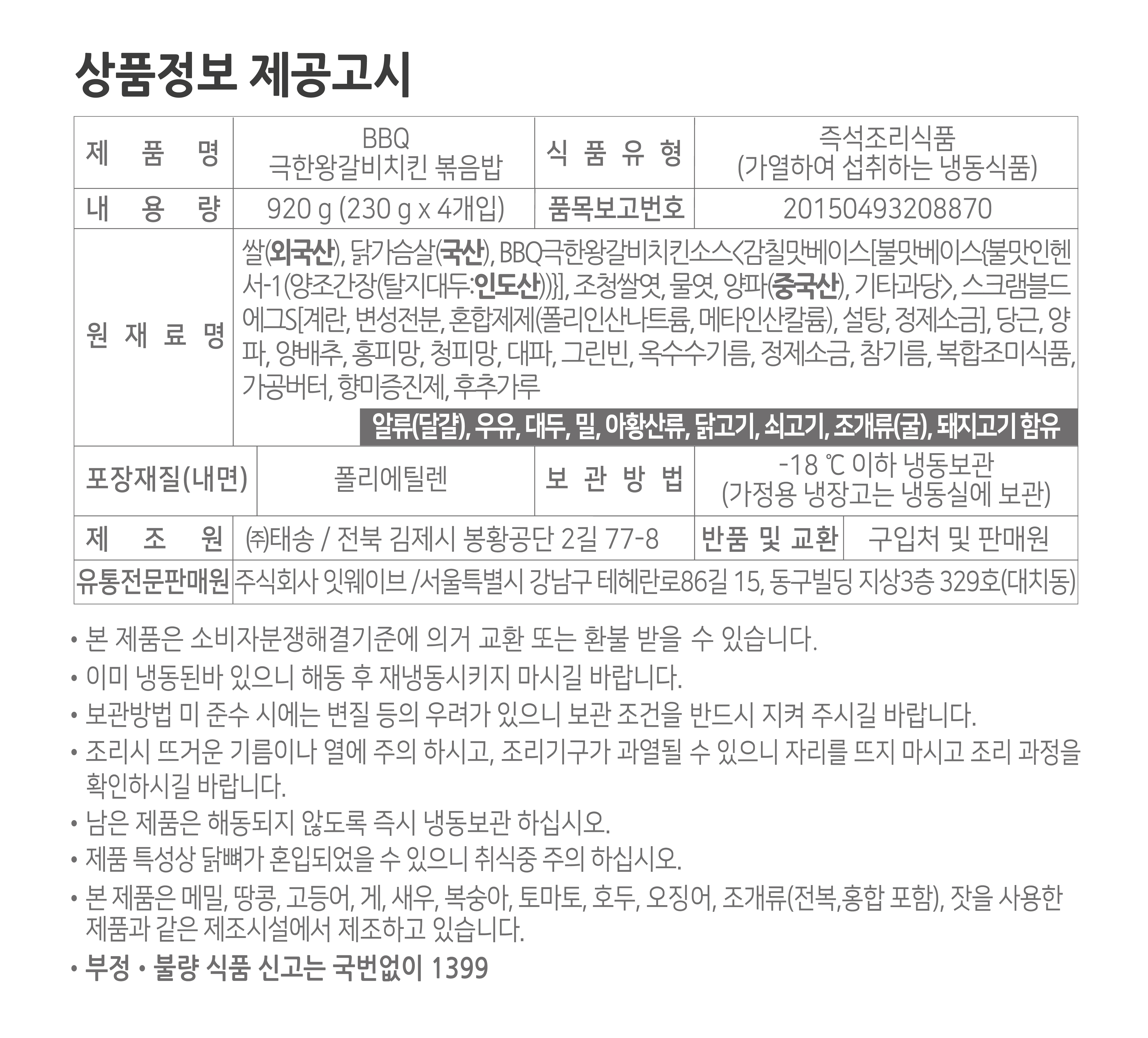하남돼지집 철판 삼겹살 마무리볶음밥 4입 920g - 쌀,돼지고기(삼겹살),대파,양파,숙주,김치,무,당근 등 유노추보 인생식당 와규 스테이크 볶음밥 4입 920g - 쌀, 쇠고기(와규),양파,대파,피망,당근,양배추 등 BBQ 극한왕갈비치킨 볶음밥 4입 920g - 쌀, 닭가슴살, 극한왕갈비치킨소스, 조청쌀엿,물엿,양파,기타과당 등 락희안 짜장밥 4입 920g - 쌀, 짜장소스, 돼지고기, 양파, 양배추, 감자, 완두콩, 옥수수기름 등 취영루 잡채밥 4입 920g - 쌀, 당면,느타리버섯,대파,표고버섯,당근,시금치