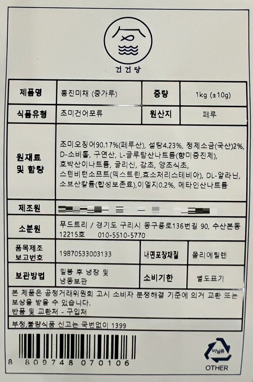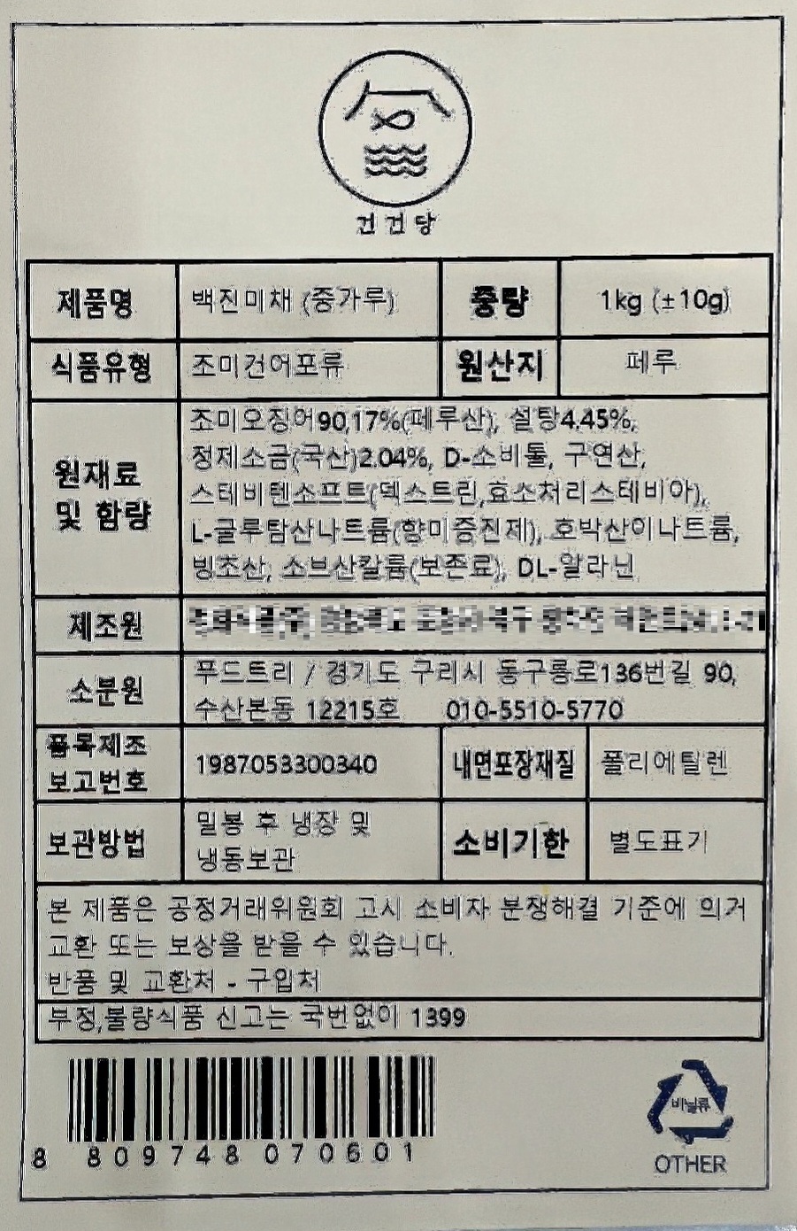 생산자 : 정화식품(주) / 경상북도 포항시 북구 청하면 해안로 2415-21 공급자 : 푸드트리/경기도 구리시 이문안로5번길 9, 103